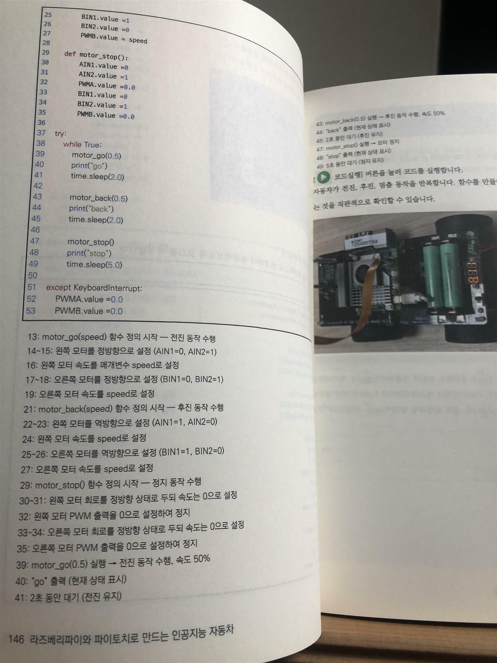 <이 글은 책과 콩나무를 통해 도서를 제공 받아 작성했습니다> 비전공자이자 일반인인 사람이 자율주행 자동차 프로그램을 직접 짤 수 있다고 한다면 몇이나 믿어줄까 게다가 그렇게 작동하는 차 모형을 만들 수 있다고 한다면. 아마도 평범한 일반 대중이라면 한 명도 없을 것이다 이 책은 그런 놀라운 가정을 현실화해주는 책이다 가장 큰 장점은 미래 지향적인 신 기술을 직접 손에 잡히도록 해준다는 것이다 컴퓨터 언어를 통해 알고리즘과 프로그래밍을 직접 작성해보고 그것을 물리적인 실체에 적용해보는 소중한 체험을 가능하게 해준다 무척 어려운 일처럼 들리지만 놀랍게도 이 책만 잘 따라가면 된다 다량의 사진 및 시각자료가 독자를 안내하고 음식 레시피를 써놓은 것 같은 상세 과정이 서술되어 있다 별다른 준비를 하거나 공부할 필요가 없다 단지 초등학생 수준의 독해력과 손기술만 있으면 된다 단계에 따라 진득하게 실천만 하면 어느새 자율주행하는 자동차 모형을 직접 만들게 되는 신비한 경험을 할 수 있다 다음으로 첨단기술에 대한 피상적인 이해나 단편적으로 접하는 지식이 아니라 본질적으로 이해하고 총체적으로 체험하는 기회를 제공하는 것이 강점이다 아무리 많은 정보를 접하거나 책을 읽더라도 직접 만들고 실현해보는 것을 능가할 수 없다 그런데 그런 현실화를 이 책은 목표로 삼고 있다 아무 것도 없는 기반에서부터 자율주행 자동차의 생성이라는 극적인 과정을 몸소 체득할 수 있다 이보다 전체적으로 인공지능과 자율주행 기술을 이해할 수는 없을 것이다