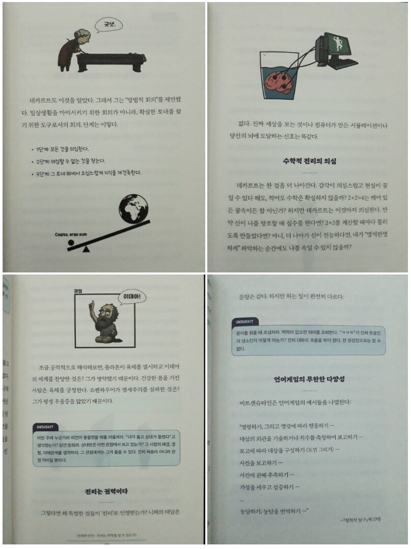 하지만 유감스럽게도 나는 저자의 추천처럼 순서대로 단계별로 읽지 않고, 마음 내키는 대로 읽어버렸다. 그 탓에 이전의 철학적 사고와의 인과관계나 연계성을 충분히 파악하지는 못했지만, 단절된 철학적 사고만으로도 얻을 수 있는 것이 적지 않았다. 이 책이 특히 재미있는 이유는, 실생활에서 누구나 한 번쯤 겪어봤거나 고민해봤을 만한 상황을 함께 던져놓고 그에 대해 철학으로 풀어가기 때문이다. 추상적이고 지리한 이론으로서의 철학이 아니라, 내 일상을 철학으로 해석하고 주석을 달아주는 방식에 가깝다. 보통 철학은 뜬구름 잡는 이야기처럼 느껴지거나 다소 교조적으로 다가오기 쉬운데, 이 책은 일상 속의 사례를 통해 이야기를 풀어가면서 어떤 형태로든 생각의 실마리나 나름의 답을 얻게 만드는 생활밀착형 철학이다. 그런 점에서 철학이 삶에 실제로 쓰일 수 있다는 효용감을 느끼게 해준다.