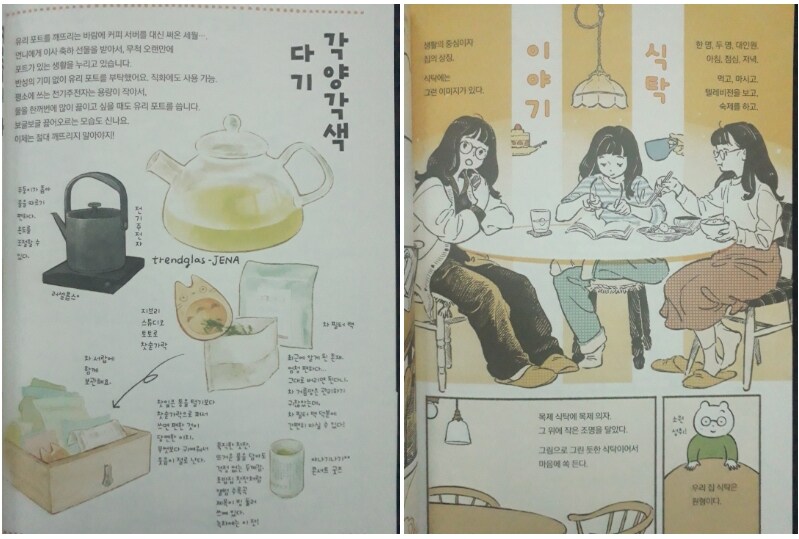 책은 상당히 얇은 편이다. 게다가 일러스트북 형식이라 텍스트의 비중도 크지 않아서 전체적으로 굉장히 빨리 읽힌다. 이런 점은 장점이기도 하지만, 반대로 보면 내용이 조금 부실하게 느껴질 수도 있다. 보통 에세이 책은 여기저기 읽을거리도 많고 곱씹을 부분도 있는데, 이 책은 에피소드 수 자체도 적고 글도 많지 않다 보니 다 읽고 나면 뭔가 허전한 느낌이 남는다. 표현하자면 팔도비빔면 하나 끓여 먹은 것처럼 어딘가 모자란 기분에 가깝다. 물론 그림을 보는 재미는 충분하다. 그림 하나하나가 예쁘고 보는 맛이 있어서, 글이 적다는 아쉬움을 어느 정도는 채워준다. 하지만 이왕이면 책의 분량이 조금 더 많았으면 좋았겠다는 생각도 든다. 페이지가 더 많았다면 작가의 그림도, 이야기도 더 많이 볼 수 있었을 텐데 그 점은 아쉽게 느껴진다. 또 처음에는 이 책에 간단한 레시피 같은 내용도 들어 있을 거라고 혼자서 기대를 했었다. 작가가 직접 만들어 먹는 음식이나 디저트의 레시피를 일러스트로 풀어 놓았을 거라고 막연히 생각했던 것 같다. 애초에 이 책은 레시피북이 아닌 에세이집이었으니 없는 내용을 기대한 쪽이 잘못이긴 하지만, 만약 레시피까지 함께 담겨 있었다면 작가의 미식생활을 따라 해 보면서 더 공감할 수 있지 않았을까 하는 아쉬움도 남는다.