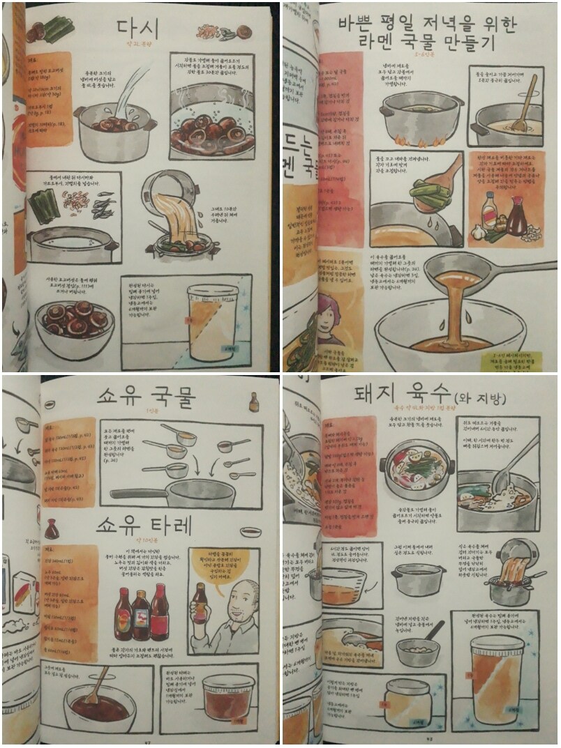개인적으로 라멘을 아주 좋아해서 한때 일본 사이트에 들락거리며 라멘 만드는 걸 공부하기도 했는데 그 당시에는 주로 국물 위주로 연구를 했었다. 일본은 면을 중요시하지만 한국 사람들은 국물을 중요하게 생각하고, 특히 개인적으로 국물에 대한 집착이 강한 편이어서 라멘 만들기는 곧 국물 만들기라고 생각할 정도로 국물에 관심을 가졌다. 반대로 그 외의 요소들은 소홀히 하고 넘겼는데 지금 생각해보면 역시 한 그릇의 완성된 라멘을 만들기 위해서는 국물뿐만 아니라 면과 차슈, 다양한 고명까지 전체적인 밸런스가 중요하다고 깨닫게 된다. 그래서 이 책을 통해 그때 등한시했던 면과 차슈, 그리고 여러 고명들에 대해 많은 것을 알게 되었고 라멘에 대한 이해를 높이는 데 큰 도움이 되었다. 물론 국물을 만드는 것도 당시에는 몇몇 가게들의 비법을 통해 소유나 돈코츠 육수 내는 방법을 단편적으로 엿보았을 뿐, 라멘 육수 전반의 기본적인 상식을 알고 있던 것은 아니었는데, 이 책을 통해 라멘에 대한 전체적인 이해와 육수 만드는 법까지 함께 배울 수 있어 상당히 유익했다.