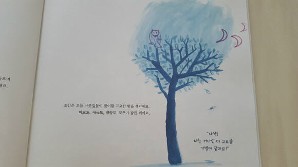 그러던 어느날 조안은 집 뒤편 숲에서 아주 작고 파란 고요를 찾습니다. 고요한 숲속에