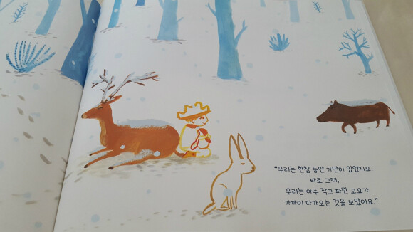 그러다가 하얗게 눈 덮인 숲속에서 아주 작고 파란 고요를 찾아냈어요. 그 소리 없는