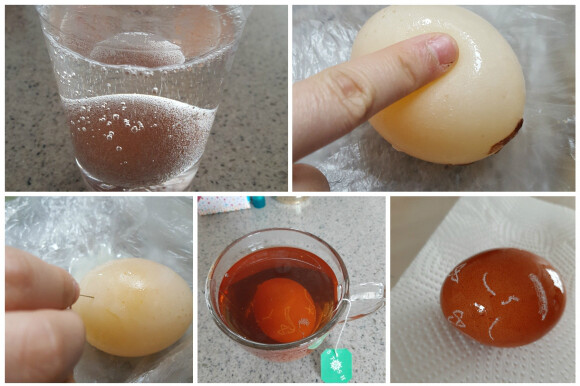 탄산이 올라오던 달걀 껍데기의 구멍에 홍차의 색 입자가 들어가 물이 들어요.