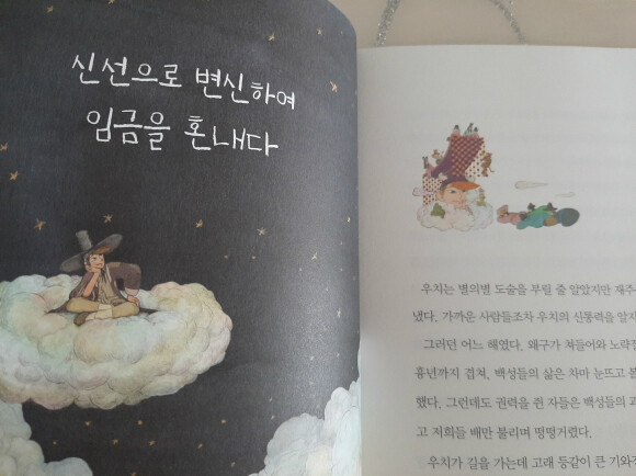 전우치의 능력 중 가장 으뜸은 변신술이예요. 신선으로 변신하는가하면 용, 호랑이, 솔개 등 동물이나 연기처럼 변해서 호리병으로 들었갔다가 사라지기도 합니다. 이런 전우치를 작가님은 상상 능력자라고 이야기합니다.