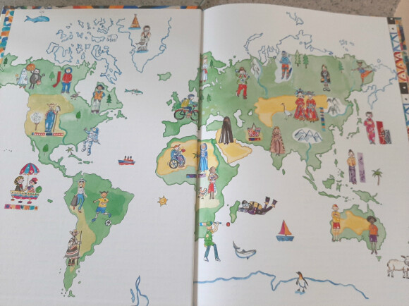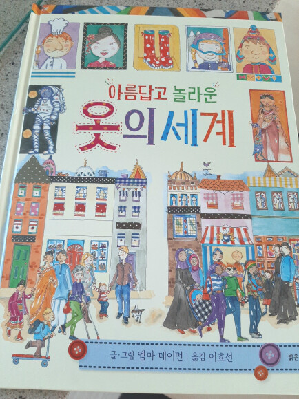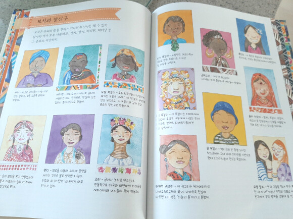 책은 세계지도안에 각나라를 대표하는 의상들이 그려져 있습니다.