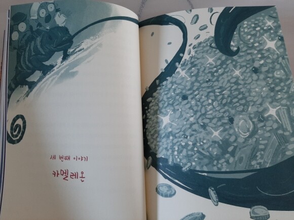 금고는 반짝반짝 보석과 돈이 잔뜩 들어있어 환합니다. 갑자기 카멜레온은 입을 쩍 벌리고....