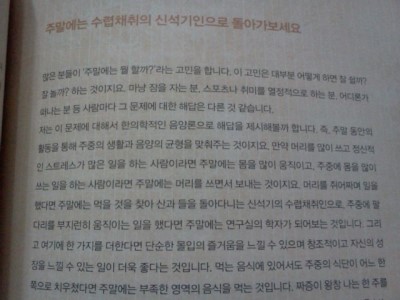 당뇨병의 경우 별것 아닌 것으로 생각할지도 모르지만 고혈압과 같은 합병증도 유발할 수 있고 인슐린 농도에 문제가 생기므로 신장에도 영향을 미치게된다. 이러한 병의 모든 근본 원인은 동서 고금을 막론하고 스트레스이다. 그래서 건강과 관련된 책을 읽어보면 항상 꾸준한 운동과 스트레스 덜 받기 이야기를 하는 것인지도 모르겠다. 특히 쉽게 할 수 있는 걷기 운동이나 스트레칭을 장려한다. 허리가 좋지 않은 경우 요통을 유발하는데 계단 오르내리기를 수개월 계속했더니 증상이 많아 나아졌다. 가끔은 틀에 박힌 생활에서 잠시 벗어나 청개구리 생활을 해보는 것도 좋다고 한다. 오른손잡이라면 왼속으로 양치를 한다거나 책에서 말한대로 계단을 한번에 두개씩 올라가보는 것도 실천해볼 만하다. 그렇게 함으로 평소에 잘 사용하지 않은 신체 부위를 사용하게 되므로 힘든 노력을 들이지 않고도 건강을 지킬 수 있을 것이다. 나만의 스트레스 해소 방법을 찾아라고 하는데 참으로 막연했다. 책 읽는 것을 좋아하는데 틈날때 마다 책을 읽고 리뷰를 쓰는데 IT업종에 종사하다보니 하루종일 컴퓨터 앞에 앉아 있다가 집에와서도 책읽고 컴퓨터앞에 앉으니 기분이 좋아지는 것 같긴하지만 뭔가 삶에 활력소가 없었다. 책을 읽다보니 문제는 바로 그것이었다. 항상 하던 일상에서 스트레스 해소를 하려니 효과가 있을리 만무했다. 항상 주말이면 주중에 쌓인 스트레스를 해소하기 위해 차를 타고 여기 저기 돌아다니곤 했다. 운전하느라 몸이 조금 피곤해지면 '아 이번 주말 보람차게 보냈구나'라는 생각을 하며 잠이 들었다가 월요일 부터 다시 지겨운 일상으로 복귀하곤 했다. 그렇다가 얼마전부터 운동을 시작하였고 그 와중에 이 책을 접하게 되었다. 평소와 다른 뭔가를 해보라는데... 역시 평소에 땀 흘리며 운동할 기회가 잘 없었는데 주말 아침에 남들보다 일찍 일어나 운동으로 하루를 시작하니 훨씬 상쾌하다.