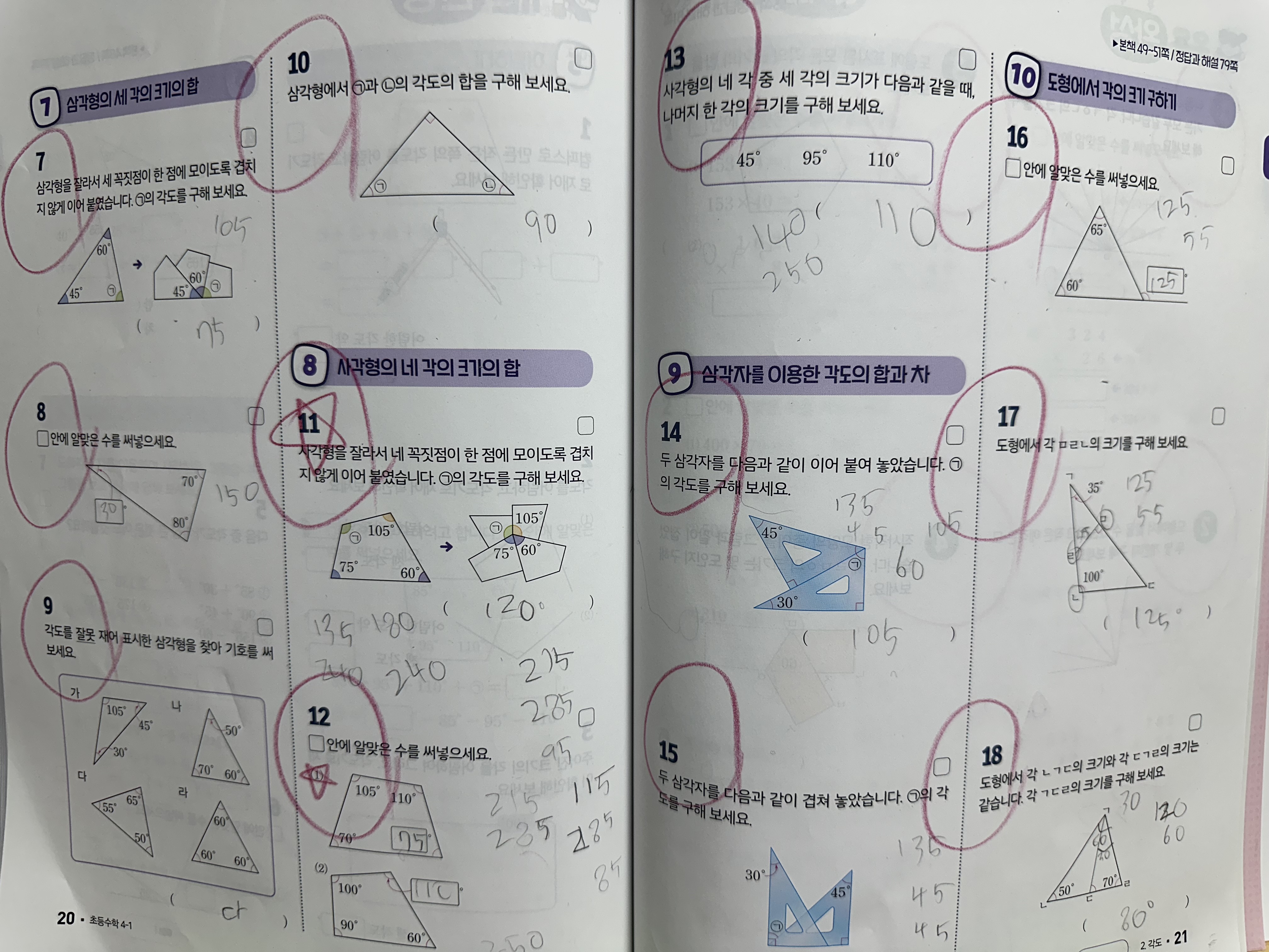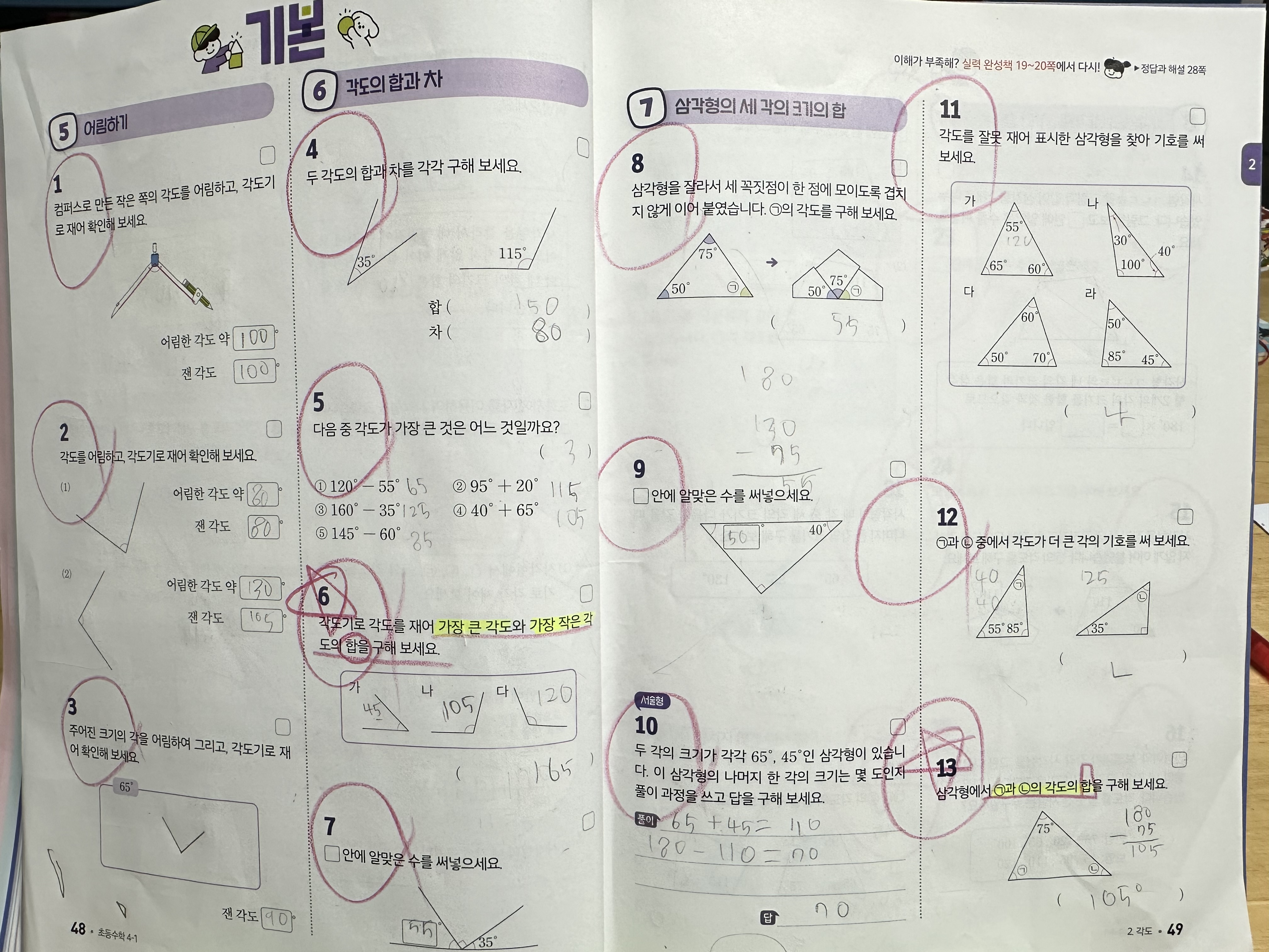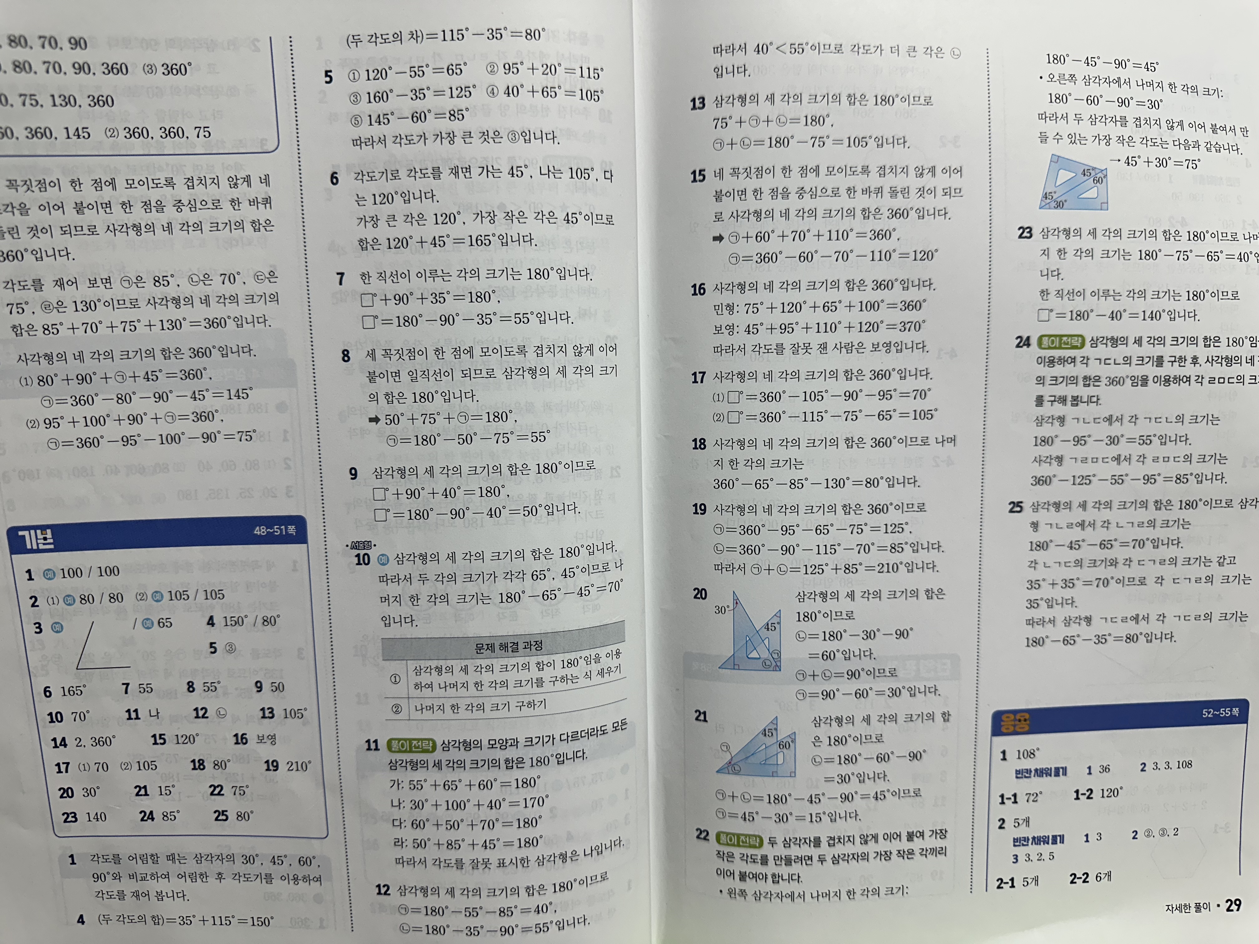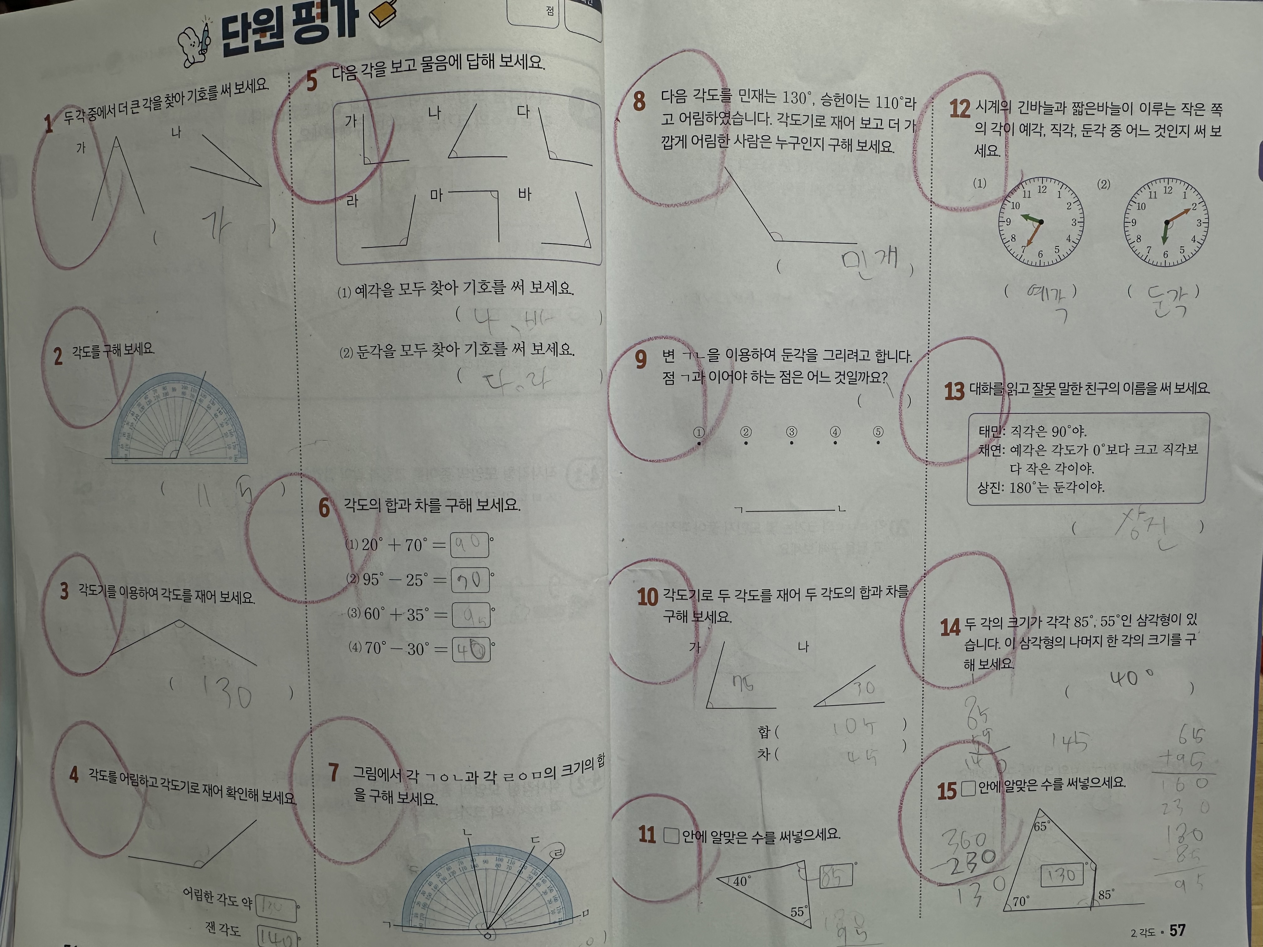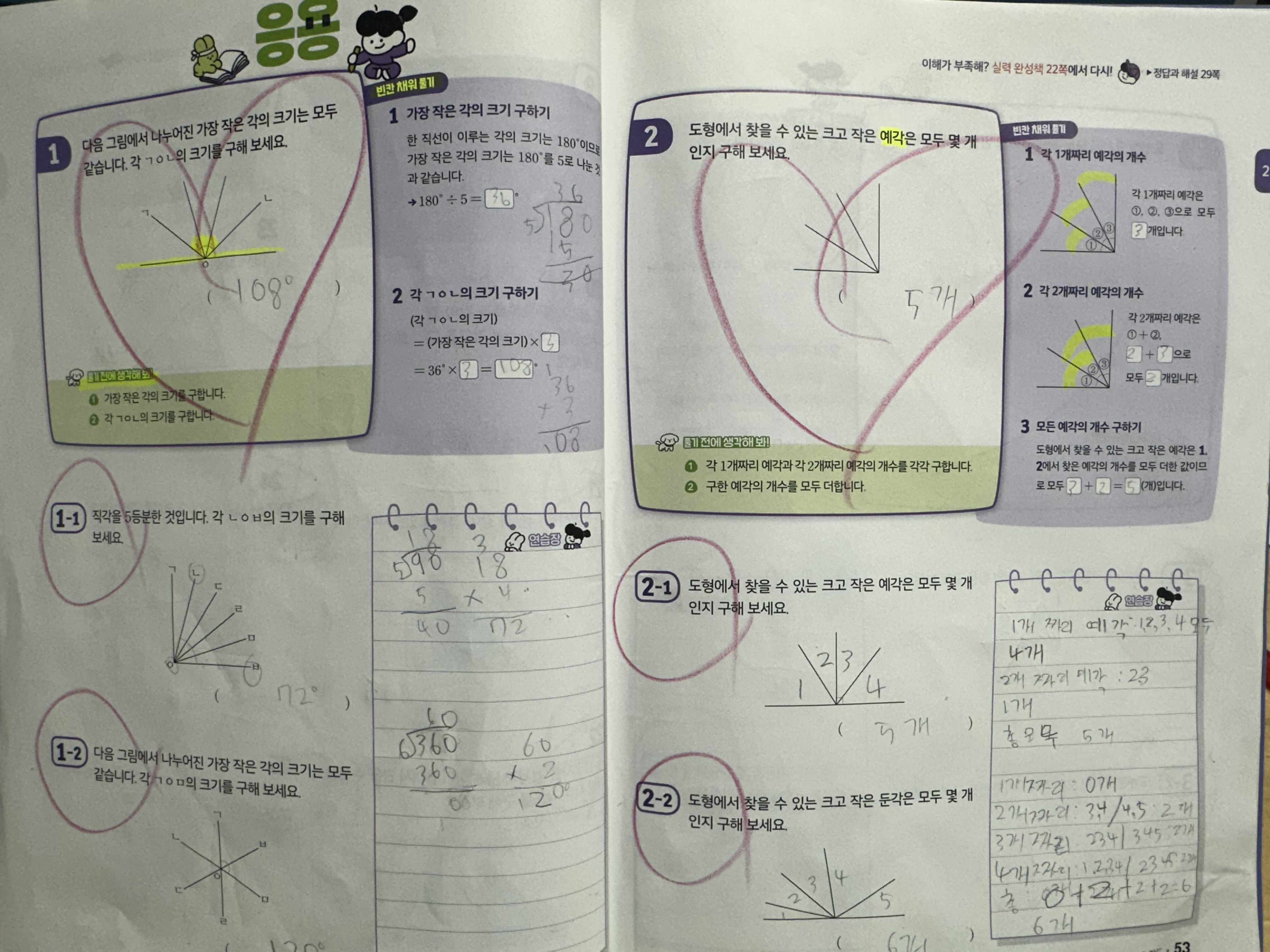 3학년 2학기때 배운 예각, 둔각 그리고 직각을 알고있다는 전제로 문제들을 풀었던거 같아요.