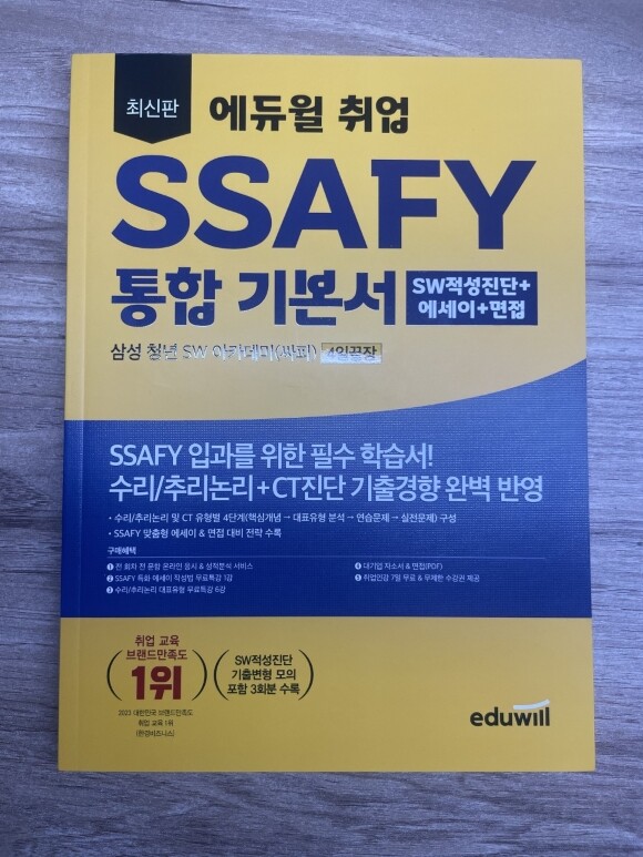 SSAFY를 준비하시면서 어떤 교재를 참고해야하나 고민이시라면 에듀윌 SSAFY 통합기본서가 좋을 것 같아요. 채용절차부터 문제풀이, 면접과 인터뷰까지 꼼꼼하게 정리되어 있어서 이제 막 시작하시더라도 제대로 방향을 잡으실 수 있거든요.
