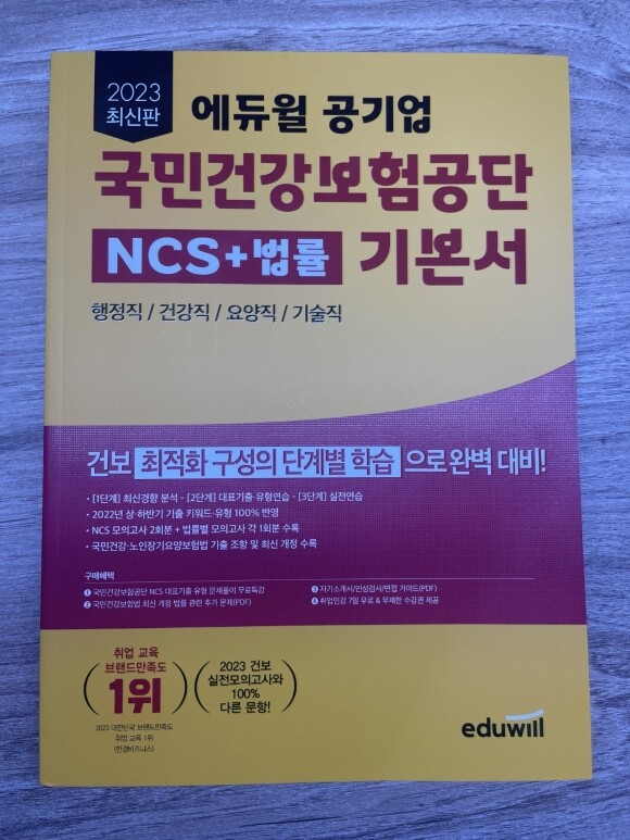 기본서이기 때문에 NCS 뿐만 아니라 법률도 수록되어 있어서 법률형 25문항을 준비하는데에도 도움을 주고 있어요. 한권으로 준비해야만 한다면 에듀윌건강보험공단 기본서로 준비하시면 좋을 것 같아요.
