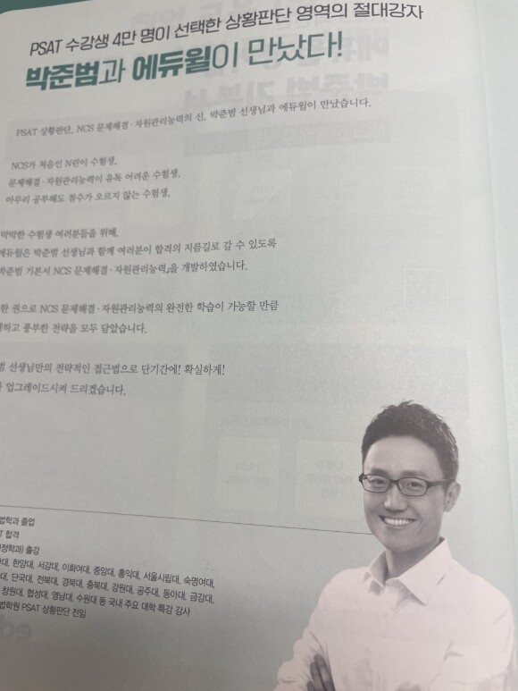 에듀윌박준범 선생님의 경우 PSAT 강의경력만 15년 이상에 PSAT관련 저서와 모의고사 문제 등을 포함해서, 공기업NCS필기 문제해결능력과 자원관리능력을 준비하는데 충분한 실력을 갖추고 계시기 때문이거든요.