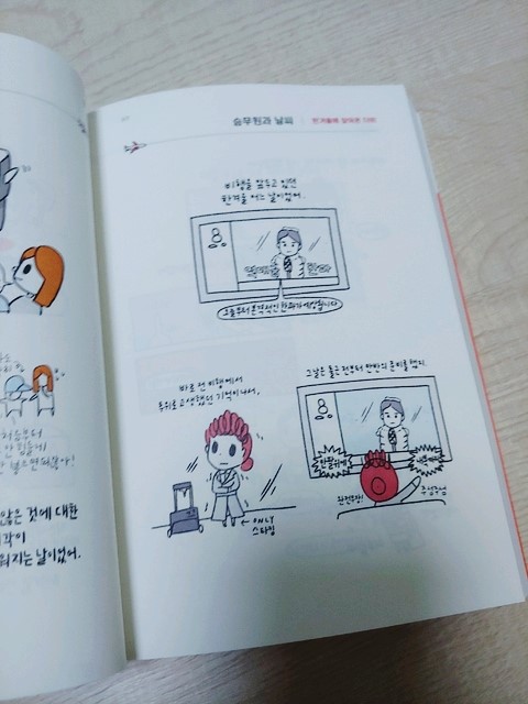 미술 전공자이자 뉴욕 현대 미술관에서 일해보는 게 목표이자 큐레일터가 되는 것이 꿈이었던 작가는 뒤늦게 승무원에 도전하게 된다. 예쁘고 산뜻한 빨간색으로 독자를 유혹하는 이 책은 책 전체가 귀염뽀짝 그 차제이다. 승무원에 지원하는 과정부터, 초보 승무원이 겪는 갖가지 에피소드, 실제로 승무원으로 일하면서 겪었던 애환들, 그리고 퇴사 후의 시간들이 귀여운 그림체와 글자체로 담겨져있어 보는 사람으로 하여금 미소를 짓게 만든다. 각각의 에피소드들이 연결된 웹툰을 한 번에 보는 느낌이라 몰입하기 좋고, 내용 또한 흥미롭다.