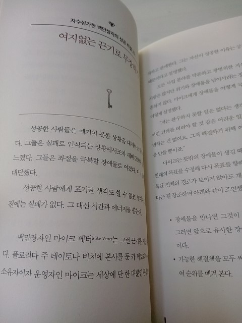 제목에 충실함을 담은 것 같다. '오직 스스로의 힘으로' 에 힘을 실어 쓴 것이 눈에 띈다. 저자가 실제로 자수성가한 백만장자들을 만나 매번 똑같은 질문들을 하면서 공통적으로 들은 답변을 52가지로 정리해두고 있고, 그것은 보통 사람들이 감히 엄두도 못낼 만큼의 부가 아니라 누구나 마음먹으면 만날 수 있는 정도의 부라는 설명도 빠뜨리지 않고 하고 있다. 하지만 여기 언급된 다양한 방법들을 고루 다 갖추고 있는 사람은 드물 것이라는 스스로에 대한 위안, 부정적인 생각이 많은 나같은 사람들은 이 책을 통해 몇 가지라도 고칠 수 있으면 다행이라는 생각으로 편하게 책을 읽어나갔다. 이 책은 돈을 관리하거나 버는 법에 관해 알려주는 것은 아니고, 자수성가한 사람들이 대체적으로 어떤 삶의 태도를 가지고 살아왔는지에 관해 이야기하고 있기 때문에 어렵지 않게 읽어나갈 수 있고, 다른 자기계발서에서 수없이 반복되었던 문장들의 총집합을 만나는 듯한 느낌을 받을 수도 있을 것이다. 무조건 백만장자를 부러워할 것이 아니라 그들의 삶을 대하는 태도를 들여다봄으로써 그들이 성공할 수밖에 없었던 이유를 한 번 살펴보고 우리도 우리의 삶의 모습에 조금씩 변화를 주고, 새로운 신념들을 만들어나갈 수 있으면 좋을 것 같다.