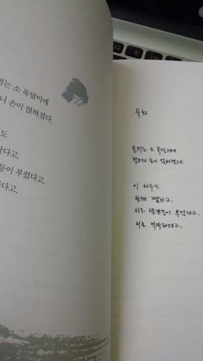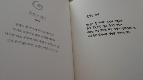 요즘 필사가 유행이다. 그저 책을 읽는것보다 그의 글을 따라 적다보면 작가와의 소통이 더 잘 이루어지고 자신의 문장력도 꽤 좋아지고 짜임새 있어진다는 느낌을 받을 수 있다. 이 책에서는 그 글이 다름 아닌 시이다. 시를 필사하면서 자신의 내면을 들여다보며 자신의 이야기를 하기도 하고 듣기도 하면서 성찰하는 시간이 되길 바란다며 이 책을 펴냈다고 한다. 성찰, 사랑, 깨달음, 위로의 시와 작가 허연의 시로 구성된 이 100편의 시집을 필사하는 동안, 자신의 꿈과 사랑, 어떤 그리움과 만나게 되길 바란다. 나와 시가 하나되는 느낌을 받는 특이한 경험을 개인적으로 안겨준 이 시집은 오래도록 잊지 못할 것 같다. 필사도 처음이지만, 그 처음 필사가 시집이라 더 새롭다. 작가가 좋아하는 시들을 모아놓기도 했고, 작가의 시도 있으니, 이 눈 내리는 겨울날 자신의 마음 속에 여백이 있다면 꺼내어 들고 하나씩 적어보면서 나름대로의 시를 음미하는 시간을 가진다면 얼마나 아름다운 시간이 될까? 특히 알고 있던 시, 좋아하는 시를 만날 때 희열을 느낄 때면 더없이 행복해짐을 느낄 수 있을 것이다. 개인적으로 필사를 하면서 느낌이 좋았던 곳을 사진으로 남격본다.