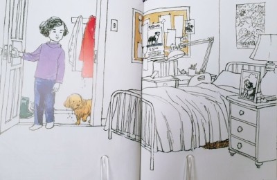 소녀의 방에는 소녀의 잃어버린 개 '도담이' 를 찾는 포스터와 도담이와 함께한 사진들이 있다. 아마 잃어버린지 얼마 안 된 모양이다.  그런 소녀에게 주인 잃은 '초롱이'가 나타나게 되고 둘은 짧은 시간에 마음을 열어버린다. 요즘엔 반려동물을 기르는 사람도 많고, 여러가지 이유로 그들을 잃어버리고 애타게 찾는 전단을 보는 일도 흔하다. 직접 경험해보지는 못했지만 이러한 그림책을 통해 그들의 마음을 대신해서 엿볼 수 있는 기회도 가지게 된다. 주인공이 돋보이는 단순한 그림, 거친 펜선, 단 몇 가지의 색으로만 표현된 그림은 독자의 가슴을 더욱더 절절하게 만든다.