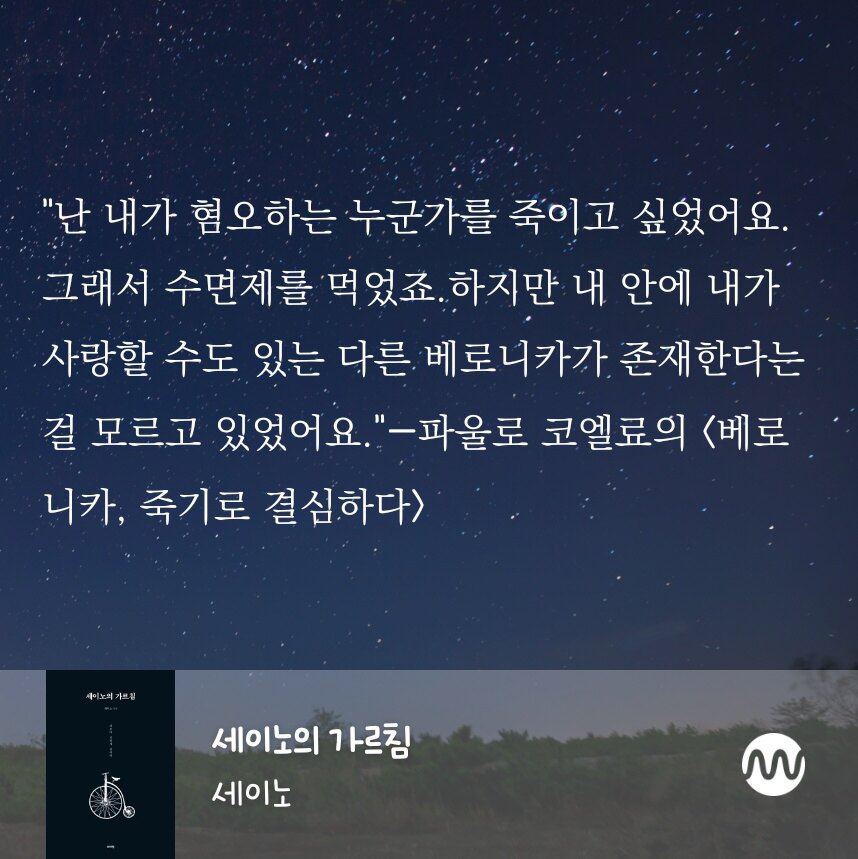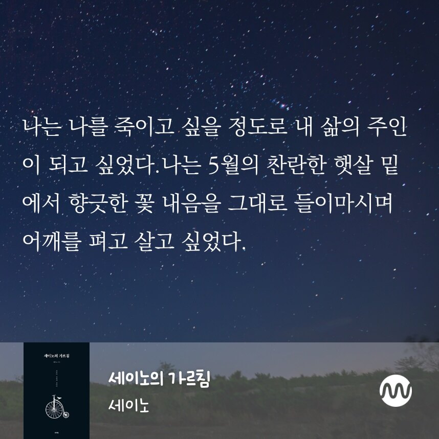 삶은 한 번뿐이다. 삶에 비굴하게 질질 끌려가지 마라. 명심해라. 당신이 분노하여야 할 대상은 이 세상이 아니다. 당신의 현재 삶에 먼저 슬퍼하고 분노하면서 ‘No!’라고 말하라. Say No! 그리고 당신의 삶을 스스로 끌고 나가라. 당신이 주인이다. - < 세이노의 가르침, 세이노 > 중에서