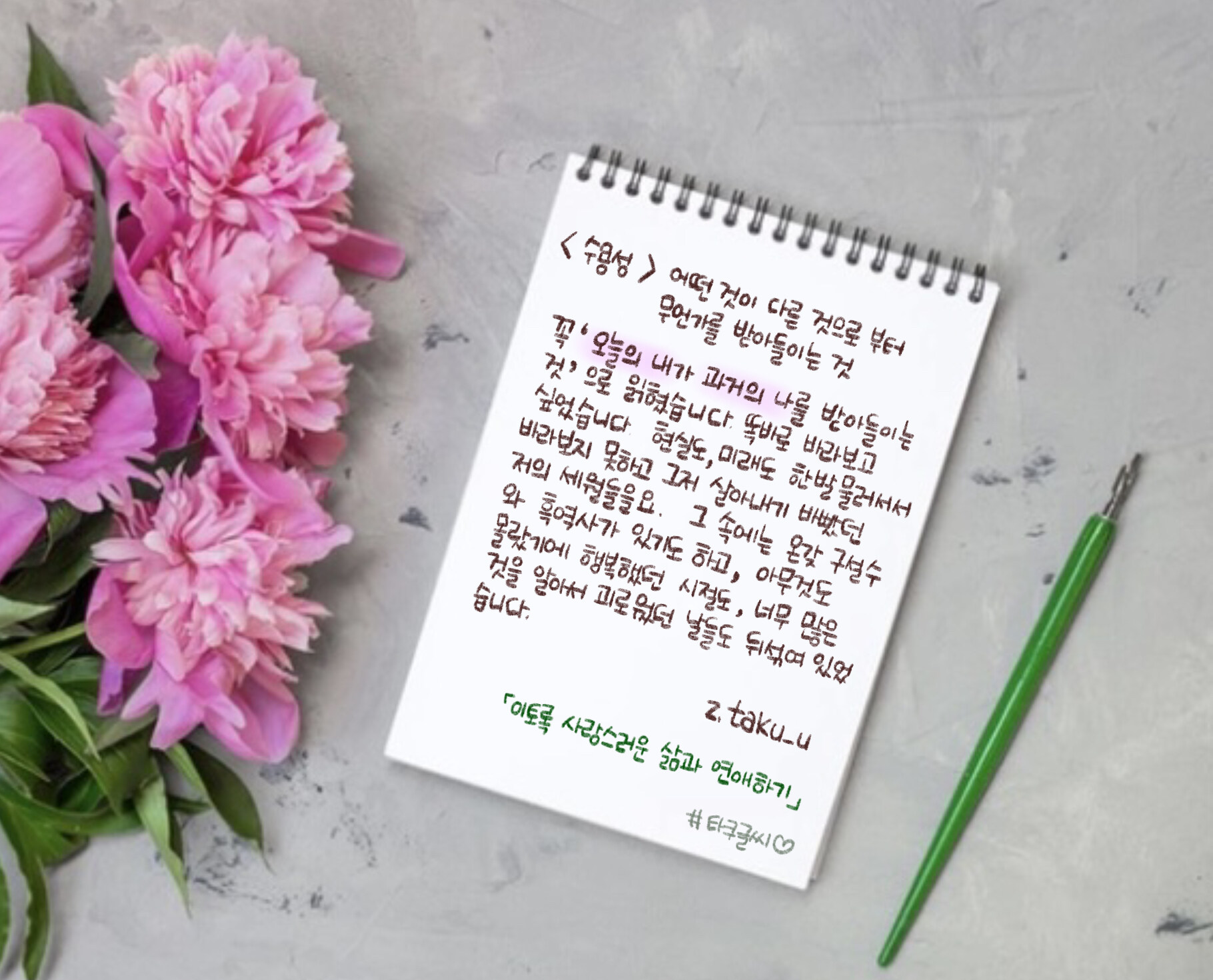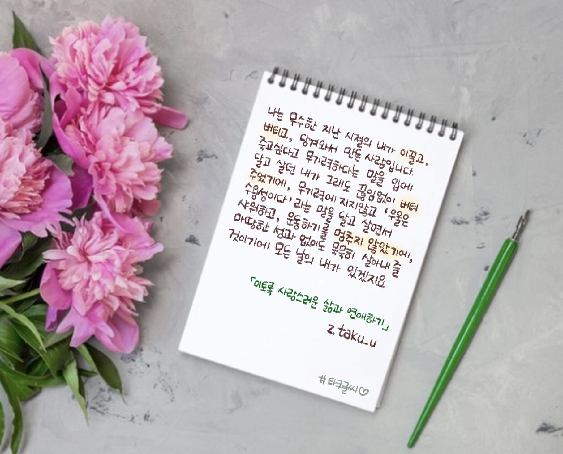 죽고 싶다고 무기력하다는 말을 입에 달고 살던 내가 그래도 끊임없이 버텨주었기에, 무기력에 지지 않고 ‘우울은 수용성이다’라는 말을 달고 살면서 샤워하고, 운동하기를 멈추지 않았기에, 마땅한 성과 없이도 묵묵히 살아내줄 것이기에 모든 날의 내가 있겠지요