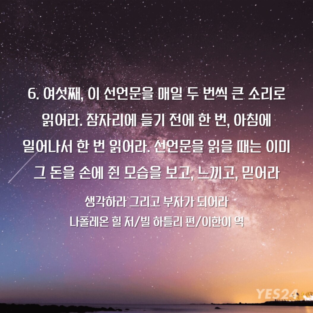 6. 여섯째, 이 선언문을 매일 두 번씩 큰 소리로 읽어라. 잠자리에 들기 전에 한 번, 아침에 일어나서 한 번 읽어라. 선언문을 읽을 때는 이미 그 돈을 손에 쥔 모습을 보고, 느끼고, 믿어라.
