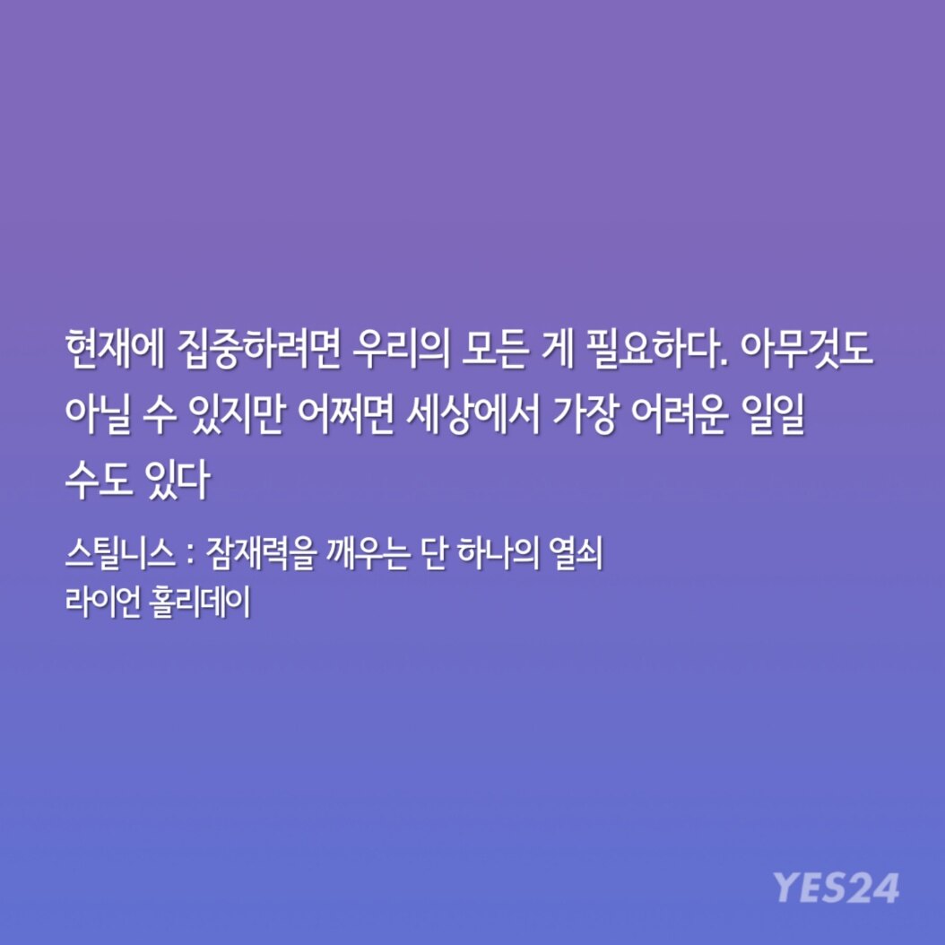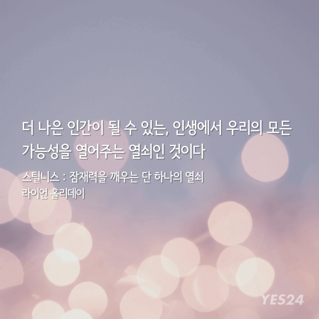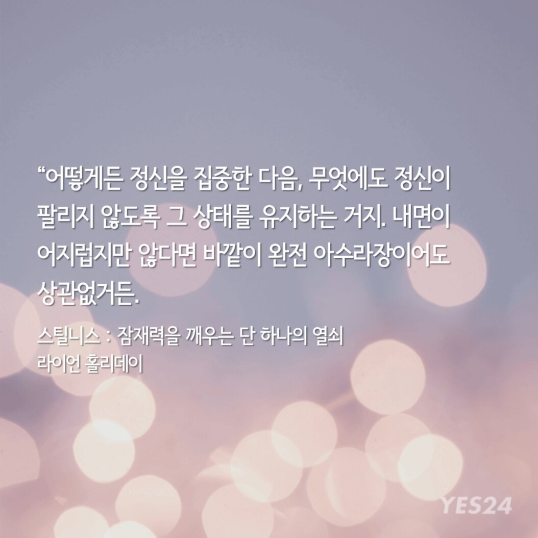 "이 책에서 라이언 홀리데이는 동서양 철학을 통달한 관점을 유감없이 발휘하며 어떻게 하면 갈등과 문제가 넘쳐나는 21세기를 살아가면서 집중과 침착함을 유지할 수 있는지 우리에게 가르쳐준다."