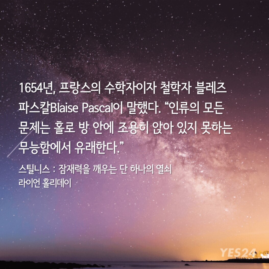 1654년, 프랑스의 수학자이자 철학자 블레즈 파스칼Blaise Pascal이 말했다. "인류의 모든 문제는 홀로 방 안에 조용히 앉아 있지 못하는 무능함에서 유래한다