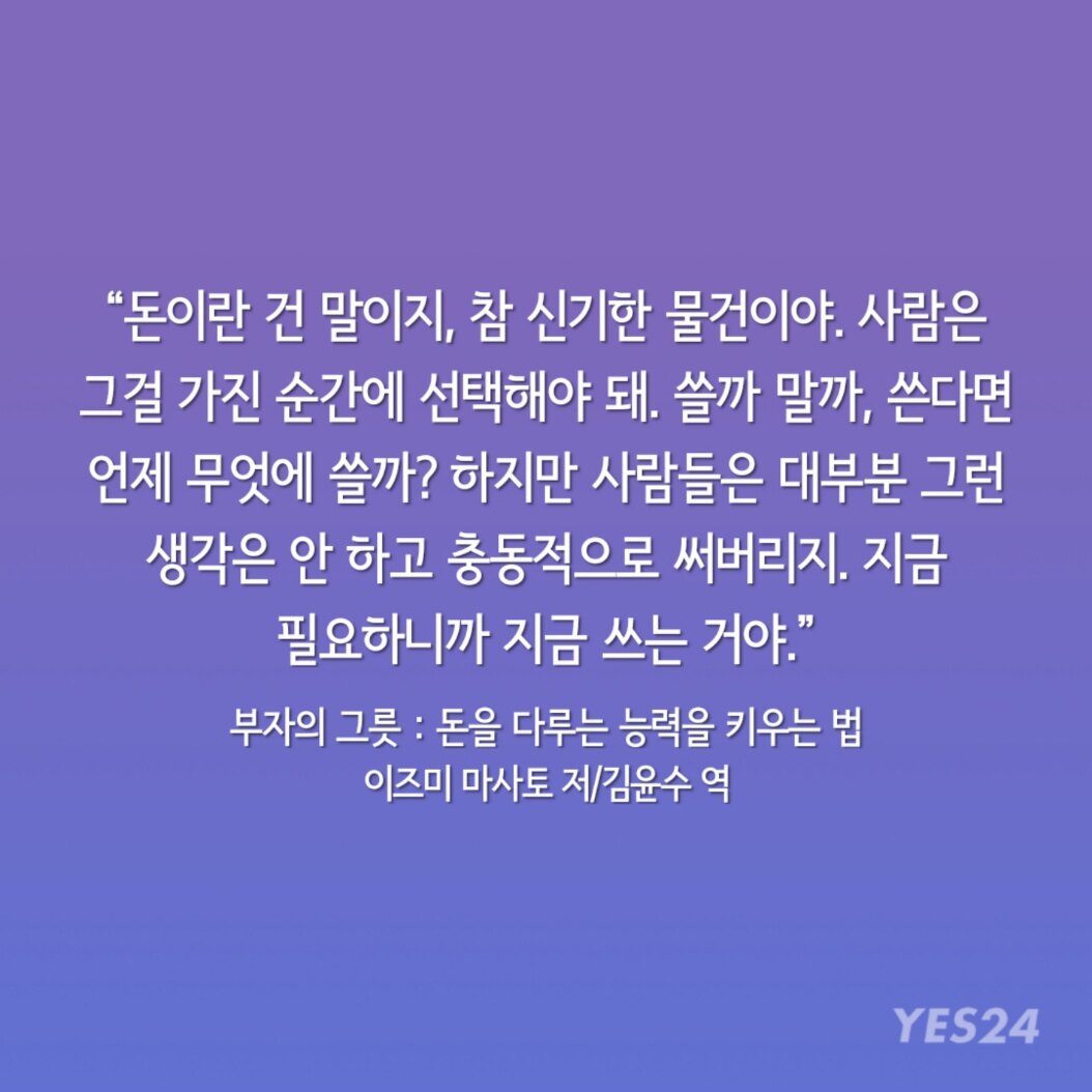 "돈이란 건 말이지, 참 신기한 물건이야. 사람은 그걸 가진 순간에 선택해야 돼. 쓸까 말까, 쓴다면 언제 무엇에 쓸까?