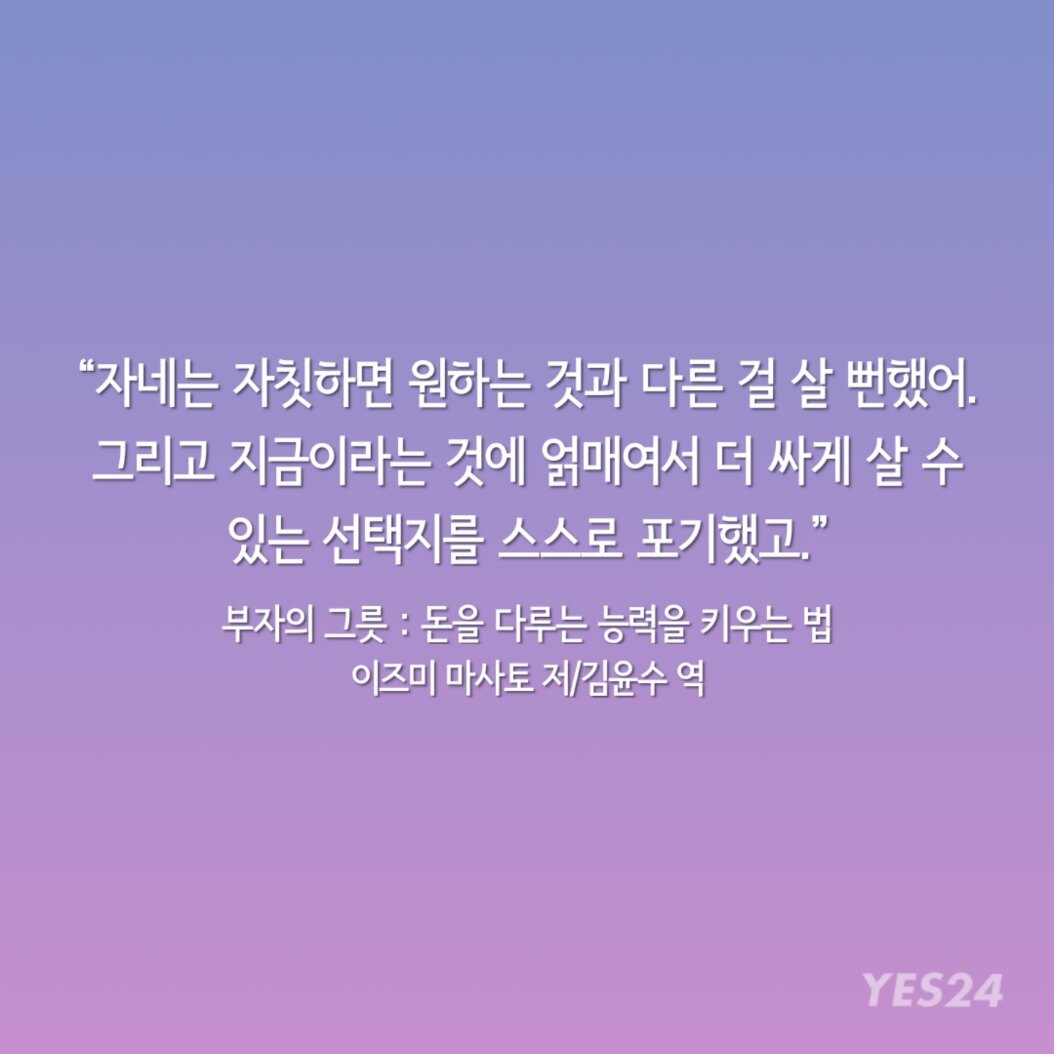 "자네는 자칫하면 원하는 것과 다른 걸 살 뻔했어. 그리고 지금이라는 것에 얽매여서 더 싸게 살 수 있는 선택지를 스스로 포기했고."
