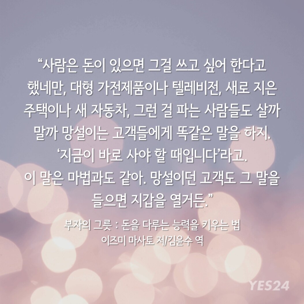 "사람은 돈이 있으면 그걸 쓰고 싶어 한다고 했네만, 대형 가전제품이나 텔레비전, 새로 지은 주택이나 새 자동차, 그런 걸 파는 사람들도 살까 말까 망설이는 고객들에게 똑같은 말을 하지.