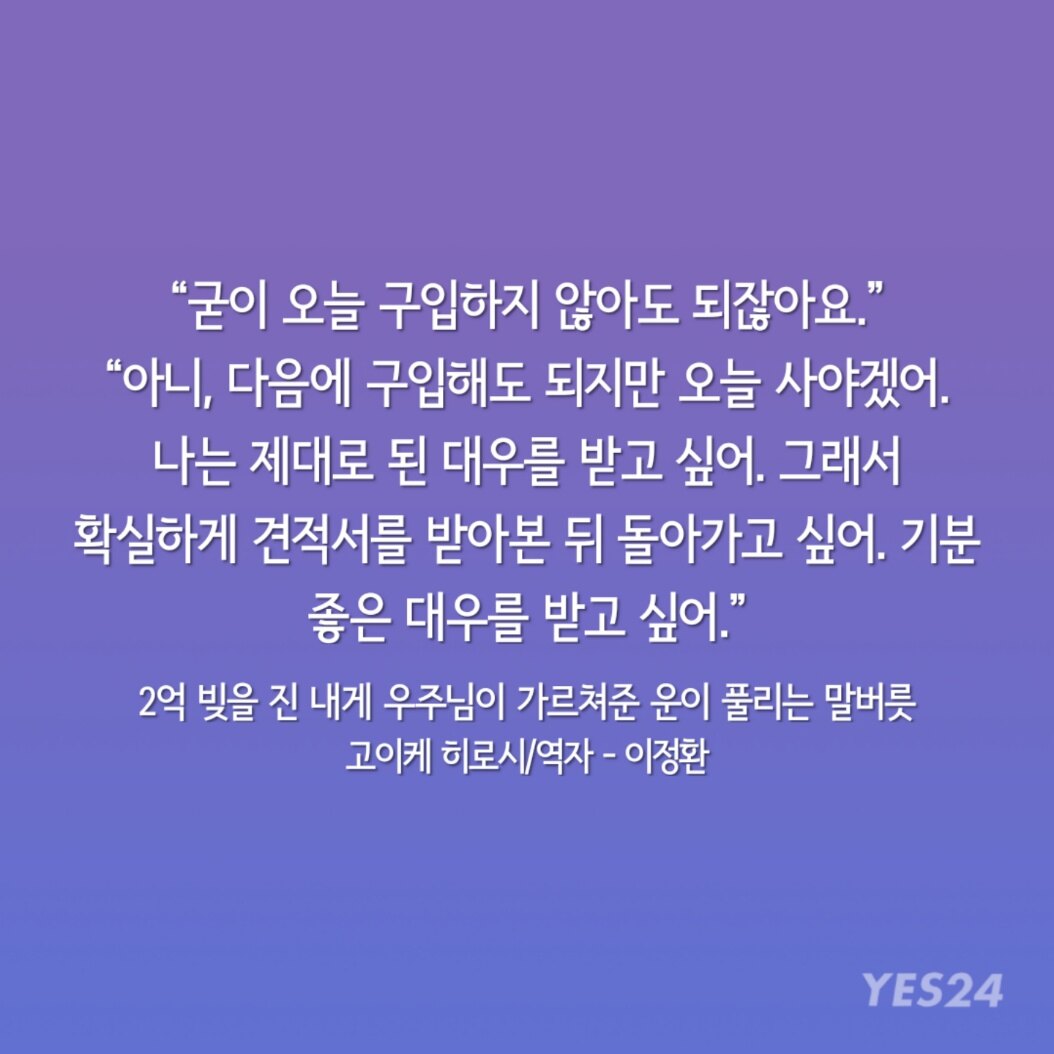 "아니, 다음에 구입해도 되지만 오늘 사야겠어. 나는 제대로 된 대우를 받고 싶어. 그래서 확실하게 견적서를 받아본 뒤 돌아가고 싶어. 기분 좋은 대우를 받고 싶어."