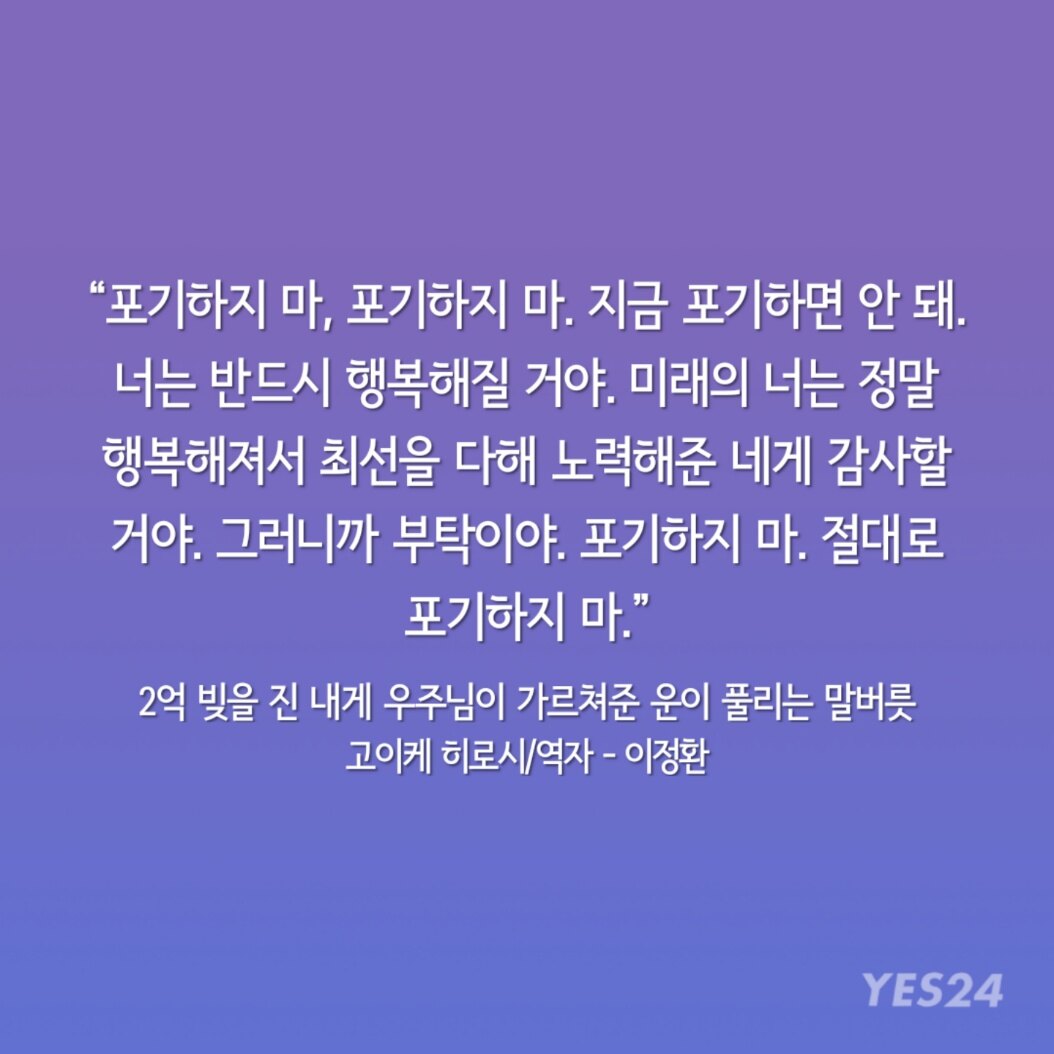 "포기하지 마, 포기하지 마. 지금 포기하면 안 돼. 너는 반드시 행복해질 거야. 미래의 너는 정말 행복해져서 최선을 다해 노력해준 네게 감사할 거야. 그러니까 부탁이야. 포기하지 마. 절대로 포기하지 마."