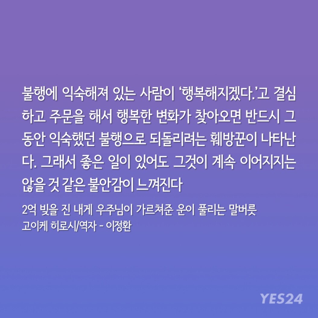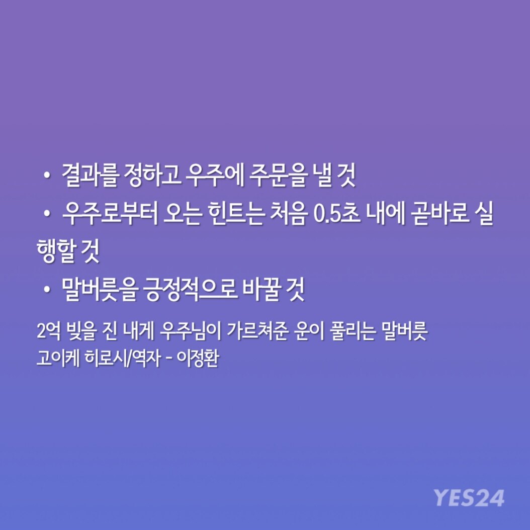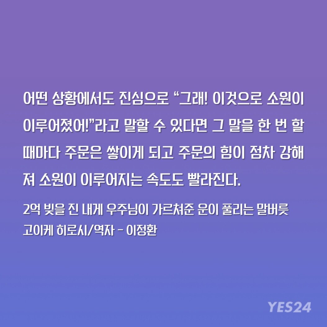 "커다란 변화와 행복을 받아들일 준비는 갖추어졌어! 그러니까 빚을 갚고 싶다는 주문과 행복해지고 싶다는 주문을 하자! 나는 빚을 갚았어! 나는 행복해졌어!"