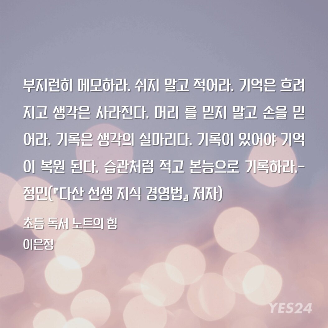 부지런히 메모하라. 쉬지 말고 적어라. 기억은 흐려지고 생각은 사라진다. 머리를 믿지 말고 손을 믿어라. 기록은 생각의 실마리다. 기록이 있어야 기억이 복원 된다. 습관처럼 적고 본능으로 기록하라.- 정민(『다산 선생 지식 경영법』 저자)
