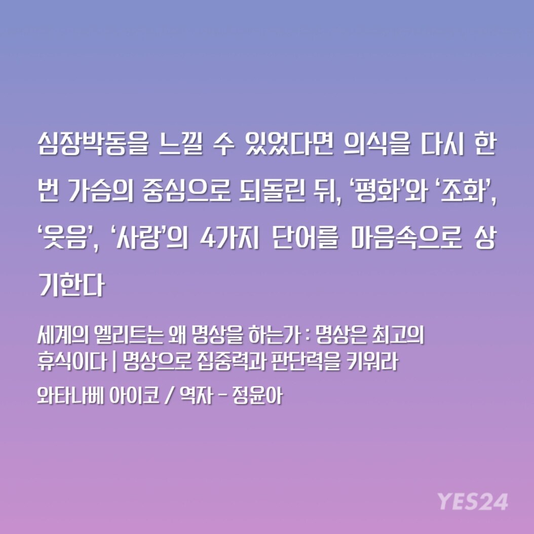 만약 조금이라도 명상이 마음에 들었다면 한 3주 정도 계속해보기를 권합니다. 틀림없이 집중력과 판단력이 향상되거나 몸과 마음의 피로감이 한결 덜해진다는 사실을 체감할 수 있을 것입니다.