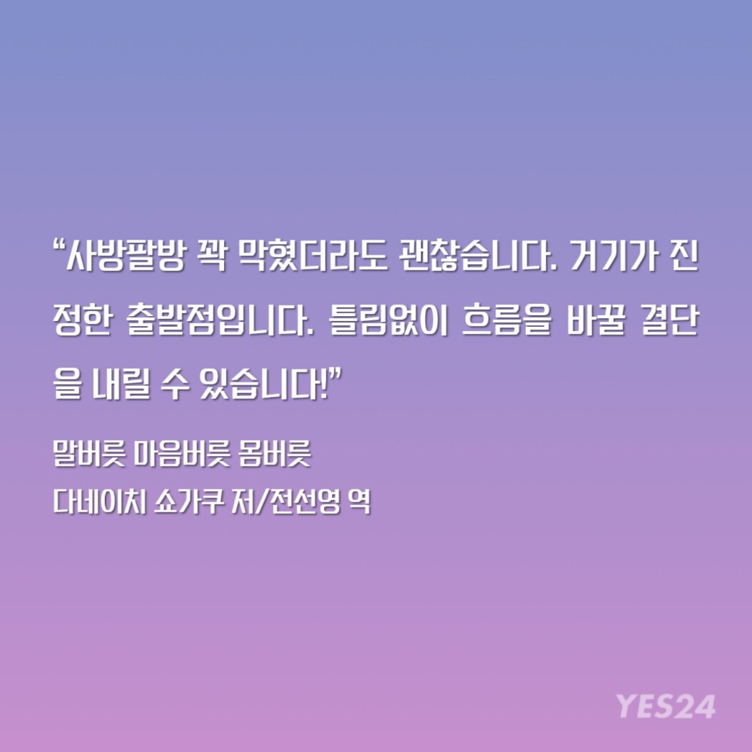 자기 본심을 꾹 숨기고 반대되는 말을 하거나(=말버릇), 얼버무리거나(=몸 버릇), 참으며(=마음 버릇) 살아왔기 때문에 포기하고, 단정 짓고 비뚤어지는 버릇이 생긴 것입니다.