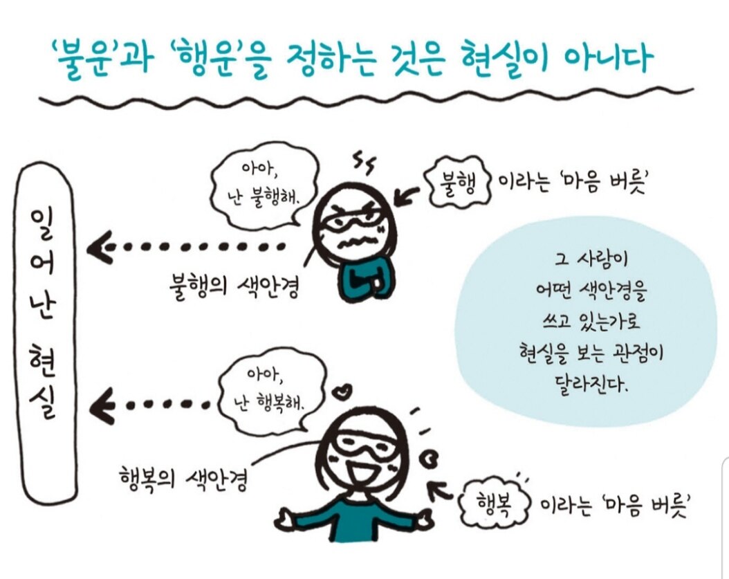 지금도 저는 똑같이 색안경을 쓰고 있지만 행복합니다. 지금 색안경에는 나는 행복하다고 믿는 마음 버릇이 칠해져 있으니까요.