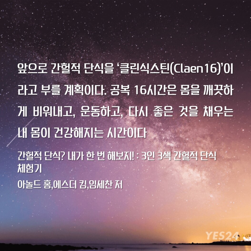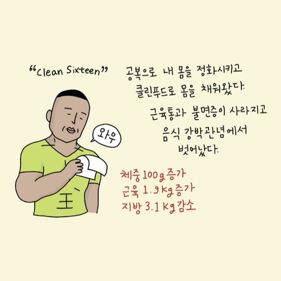앞으로 간헐적 단식을 ‘클린식스틴(Claen16)’이라고 부를 계획이다. 공복 16시간은 몸을 깨끗하게 비워내고, 운동하고, 다시 좋은 것을 채우는 내 몸이 건강해지는 시간이다.