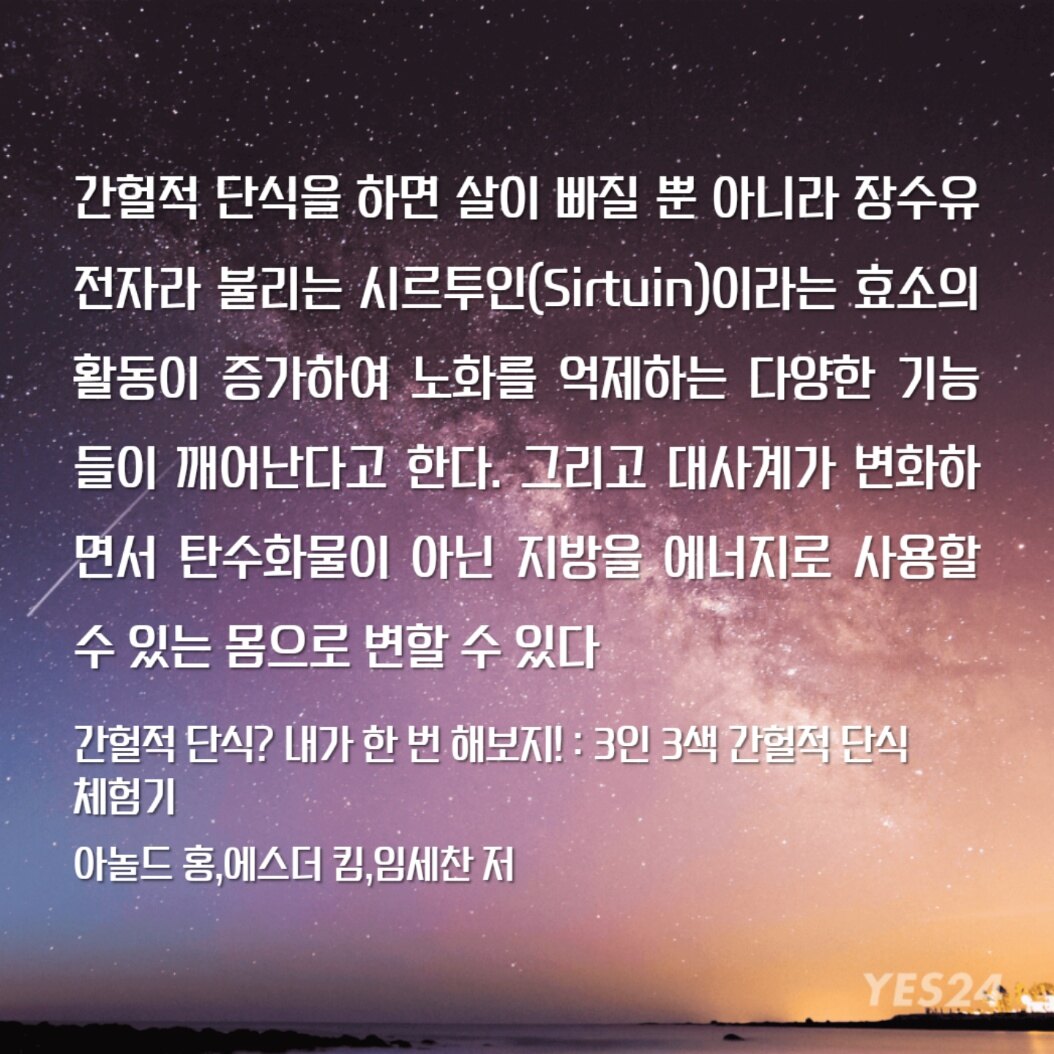 간헐적 단식을 하면 살이 빠질 뿐 아니라 장수유전자라 불리는 시르투인(Sirtuin)이라는 효소의 활동이 증가하여 노화를 억제하는 다양한 기능들이 깨어난다고 한다.