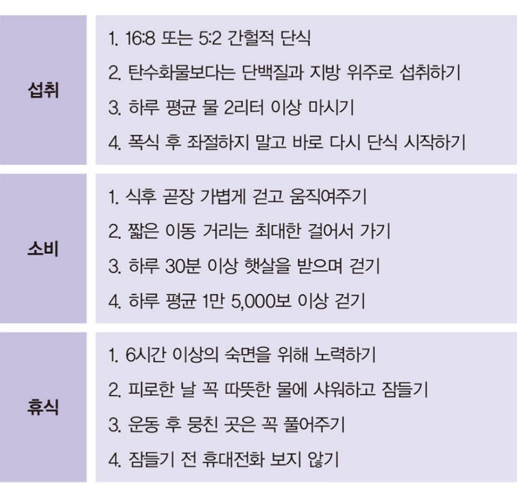 음식의 양보다는 빈도가 중요하다. 몸이 소량이라도 인슐린을 분비하기 시작하면 우리 몸은 지방을 태우는 대사를 멈춘다.