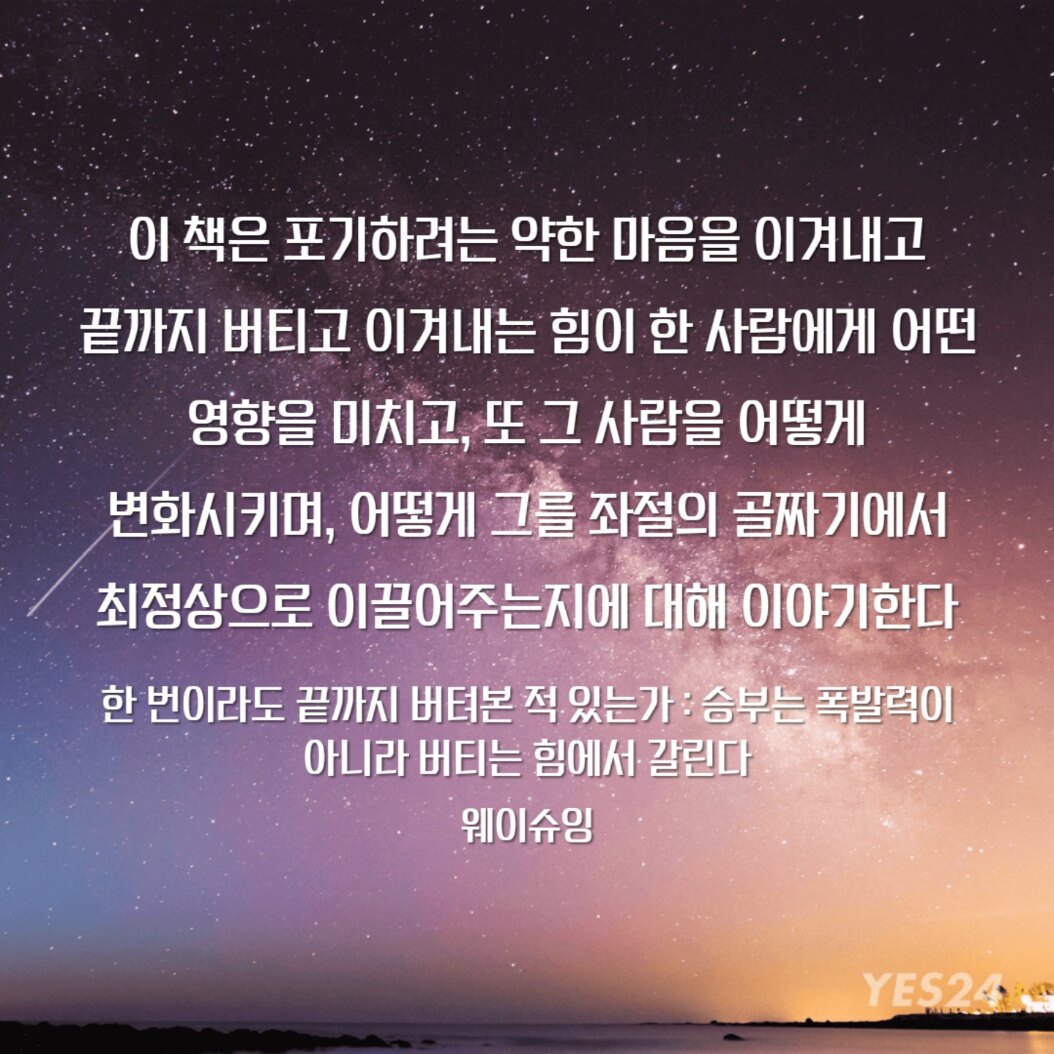 끝까지 버티고 이겨내려는 끈기와 의지가 없다면 결코 자신의 꿈에 다가갈 수도 목표한 바를 이룰 수도 없다.