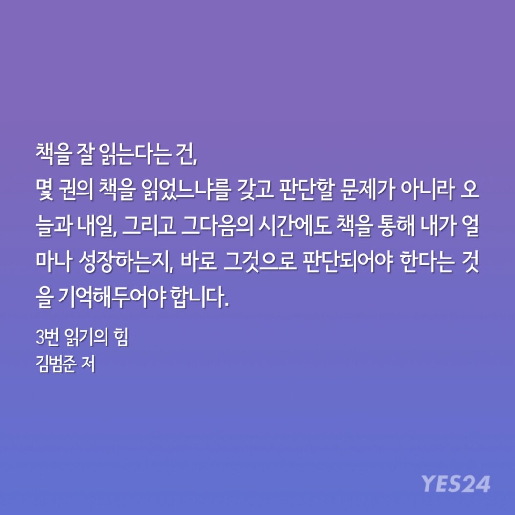 몇 권의 책을 읽었느냐를 갖고 판단할 문제가 아니라 오늘과 내일, 그리고 그다음의 시간에도 책을 통해 내가 얼마나 성장하는지, 바로 그것으로 판단되어야 한다는 것을 기억해두어야 합니다.