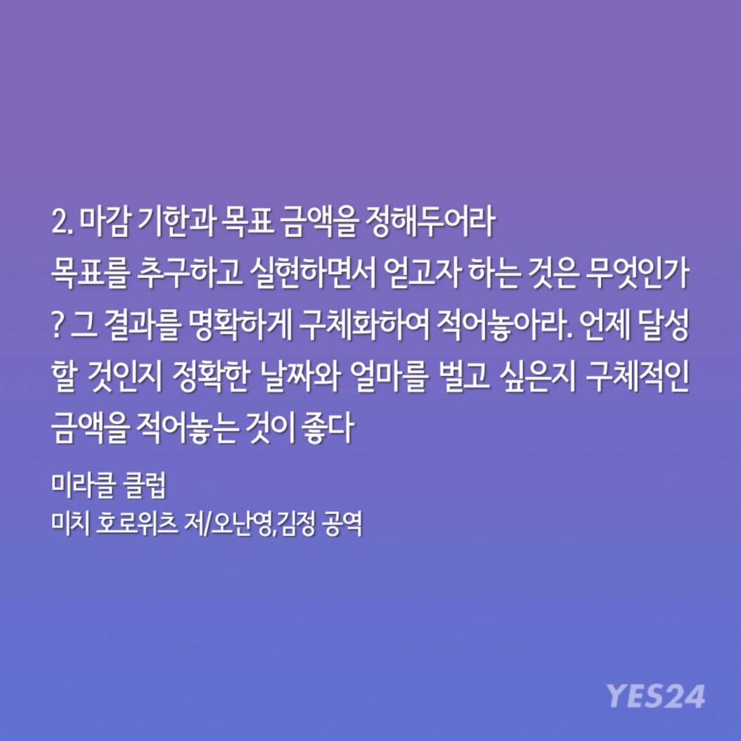우리 마음은 창의적인 기관이다. 마음에 강하게 새겨지는 생각은 삶에서 실현되는 일들의 원인이 된다. 거기에는 돈도 포함된다