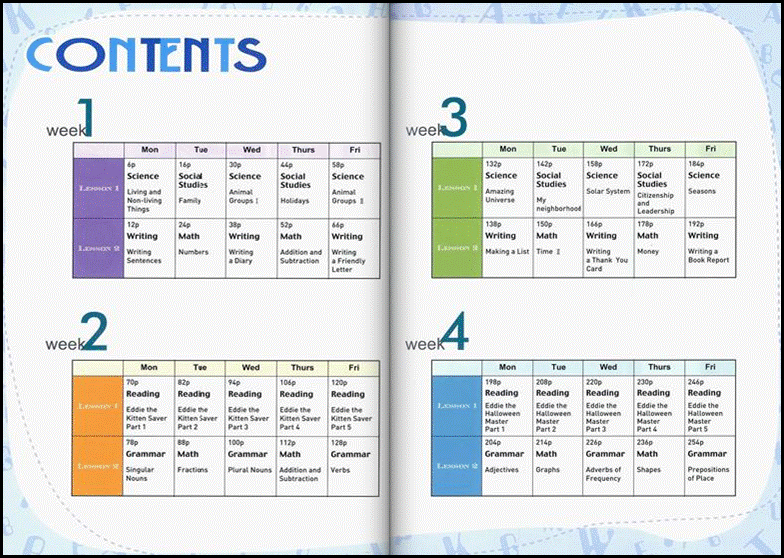 총 4주에 걸쳐서 과학, 수학, 문법, 읽기, 쓰기의 5영역이 골고루 학습할 수 있도록 구성되어 있어요.