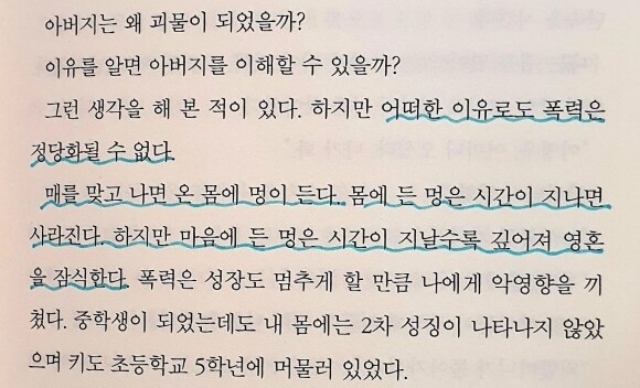 "네 아버지가 변하면 좋으련만 안타깝게도 그런 사람은 쉽게 안 변해. 그나마 다행스러운 것은 그런 자들은 자기보다 강한 사람은 절대 안 건드린다는 거야. 비열한 놈들이지. 어쩌겠느냐, 그게 네 아버지인걸…….”