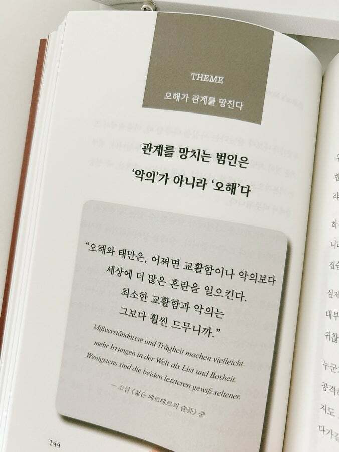 지금까지 괴테의 문장들에 대해서 잘 알지 못했는데 이번은 계기로 더욱 잘 알게 되었고요.관계를 망치는 범인은 악의가 아니라 오해라는 말은