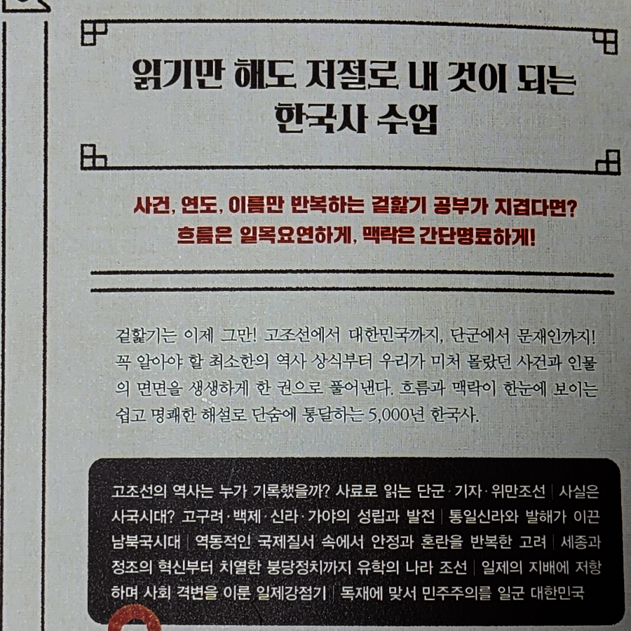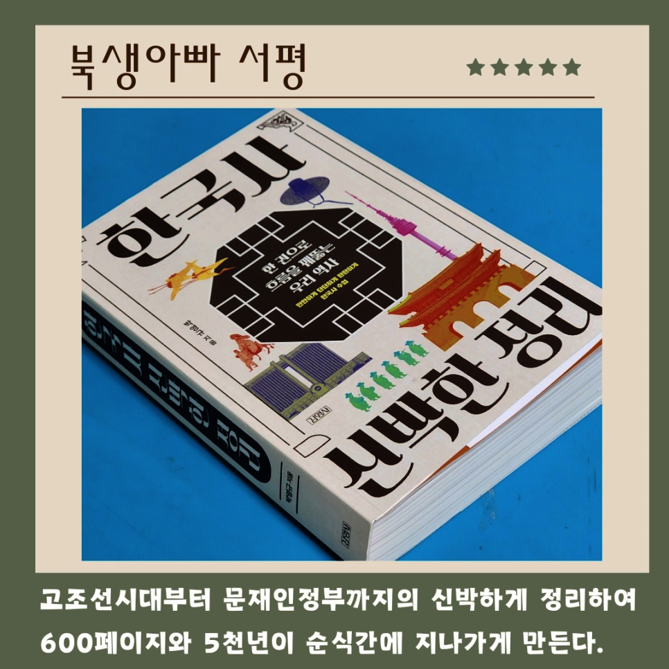저자의 통찰력 있는 분석과 정리로 고조선부터 문재인까지 우리 한국사를 거시적으로 바라보는 데 큰 도움이 되었습니다. 한 번에 다 읽지않더라도 필요할 때마다 찾아 읽는데도 도움되겠어요. 내년에 한국사를 배우게 되는 큰아들에게 선물로 주려 합니다.