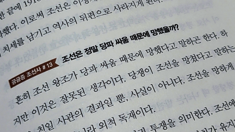 붕당 정치가 시끄럽지만 평민의 삶은 안정되고 나라는 발전했기 때문에, 붕당정치가 나라를 망하게 했다는 것은 잘못된 역사관이라 주장합니다. 반면 외척이 조정을 장악했을 때 탐관오리가 판을 치고 백성은 굶주림에 시달리고 나라는 망국으로 향했다는 것이죠. 싸우는 정치인이 아니라 싸우지 않는 정치인을 비난해야 한다는 저자의 시선은 현대에도 시사하는 바가 크다고 생각합니다.