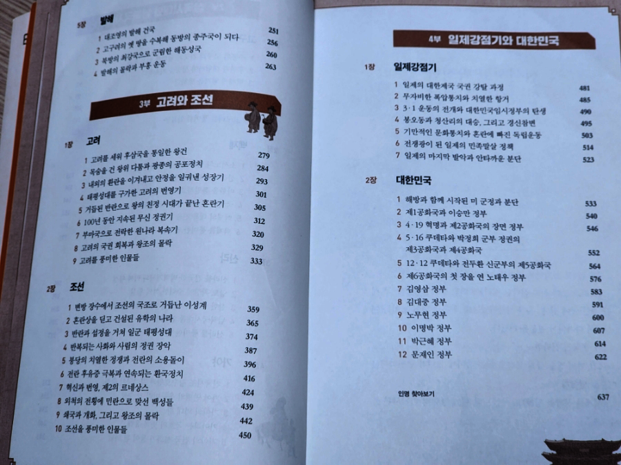 1부. 고조선과 단군신화2부. 삼국시대와 남북국시대3부. 고려와 조선4부. 일제강점기와 대한민국(문재인정부까지)