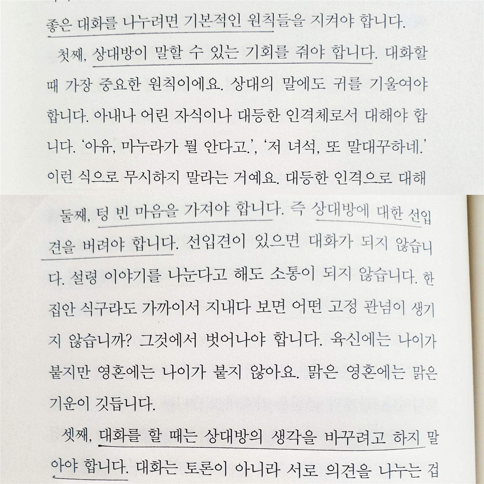 셋째, 대화를 할 때는 상대방의 생각을 바꾸려고 하지 말아야 합니다. 대화는 토론이 아니라 서로 의견을 나누는 겁니다.