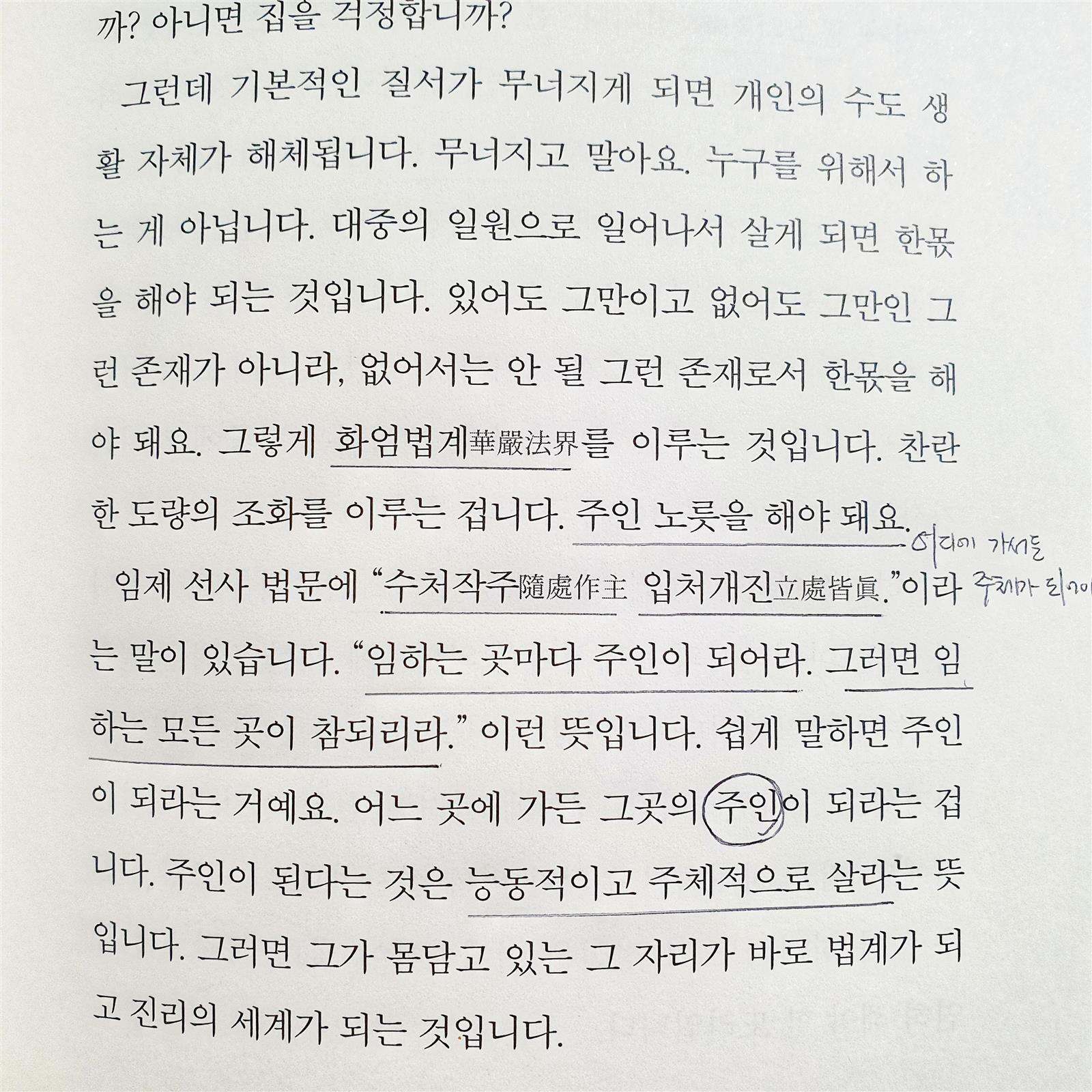 🔹️임제 선사 법문에 "수처작주隨處作主 입처개진立處皆眞."이라는 말이 있습니다. "임하는 곳마다 주인이 되어라. 그러면 임하는 모든 곳이 참되리라." 이런 뜻입니다. 쉽게 말하면 주인이 되라는 거에요. 어느 곳에 가든 그곳의 주인이 되라는 겁니다. 주인이 된다는 것은 능동적이고 주체적으로 살라는 뜻입니다. 그러면 그가 몸담고 있는 그 자리가 바로 법계가 되고 진리의 세계가 되는 것입니다.