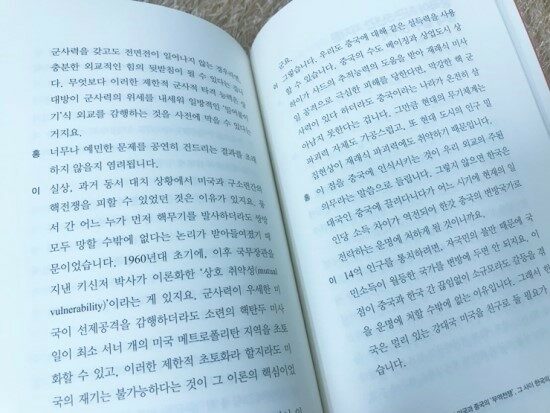 “2017년 말 북한의 대륙간 탄도미사일 실험으로 수소폭탄과 핵탄두 소형화의 가능성이 커지자 미국은 이를 계기로 중국의 야망을 견제할 기회를 갖는다. 중국도 러시아와 더불어 유엔 안전보장이사회 결의안으로 북한제재에 동참할 수밖에 없게 되었고, 이에 배신감을 느낀 김정은이 ‘한반도 비핵화’를 선언하게 되었다. “