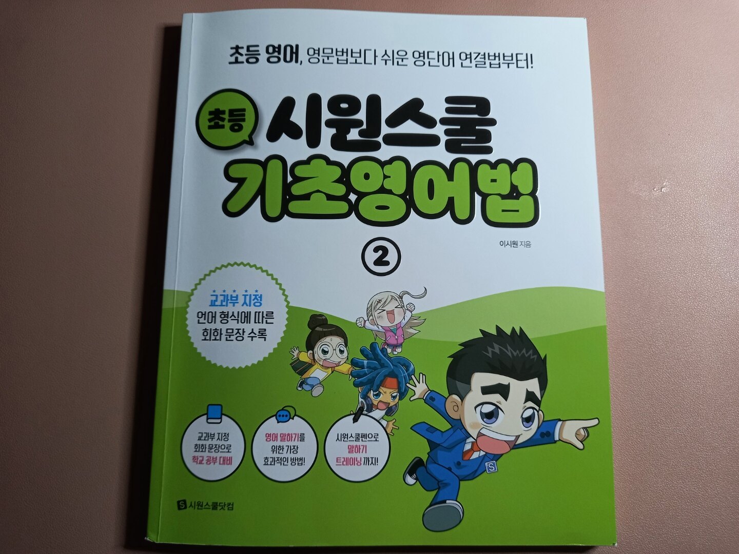 <시원스쿨 초등 기초영어법>이라는 책이에요. 딸 아이가 시원쌤 캐릭터를 책 표지에서 보더니 무척 반가워하네요.